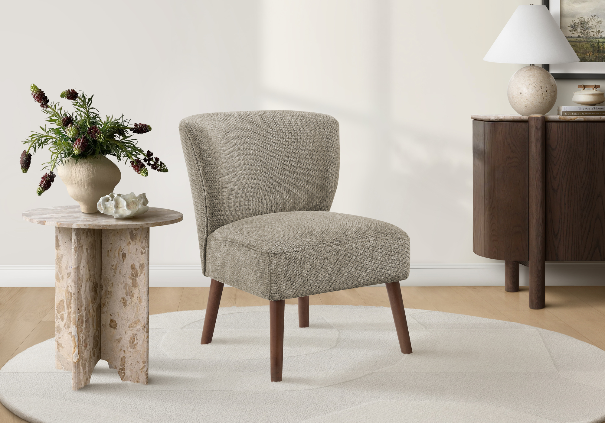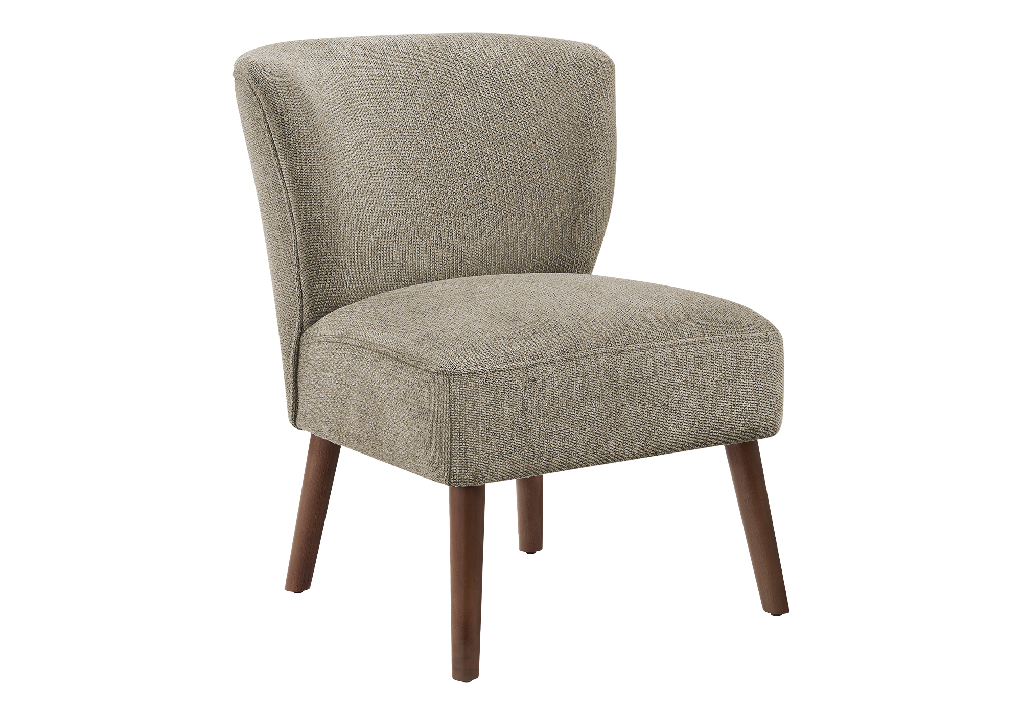 Add a refined touch of character to your home with this beautifully designed accent chair, created for those who value both comfort and style. Standing 33″ high, it makes a striking statement in a modern living room or a cozy bedroom alike. Upholstered in light brown fabric, the chair introduces a vibrant yet sophisticated accent that complements a variety of décor styles. A gently curved back enhances ergonomic comfort, while plush foam cushioning wrapped in soft touch fabric creates an inviting place to sit, relax, or unwind with a good book. Crafted with a solid engineered wood frame and supported by sturdy walnut solid wood legs, this accent chair reflects timeless mid century influence with sturdy construction built for everyday use. Its armless design allows for flexible placement and easy movement, making it a versatile addition to any space. Designed for convenience, the chair assembles easily with clear instructions and is backed by a 2-year limited warranty for added peace of mind. Sleek, comfortable, and thoughtfully constructed, this accent chair effortlessly blends modern appeal with fashionable style.