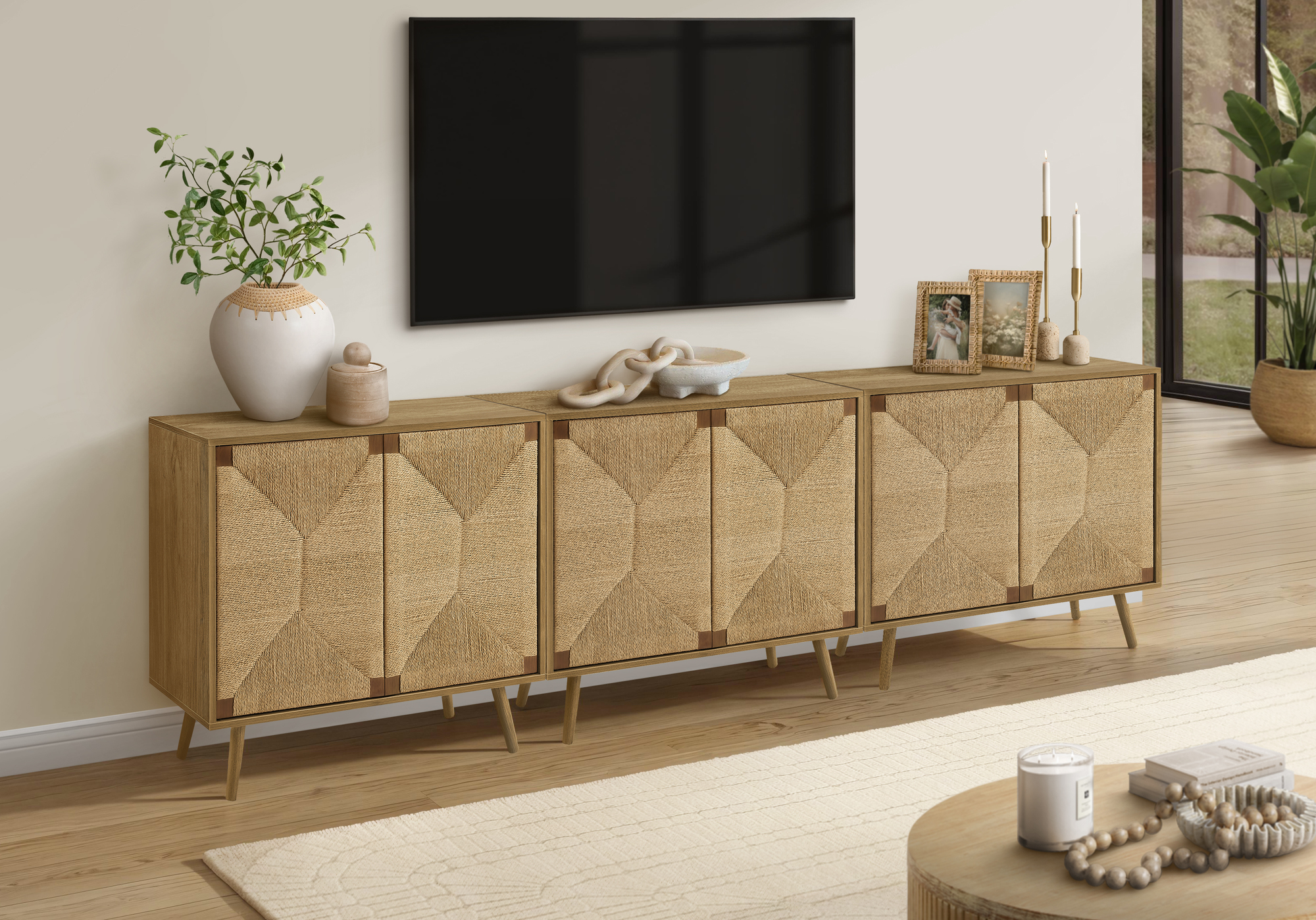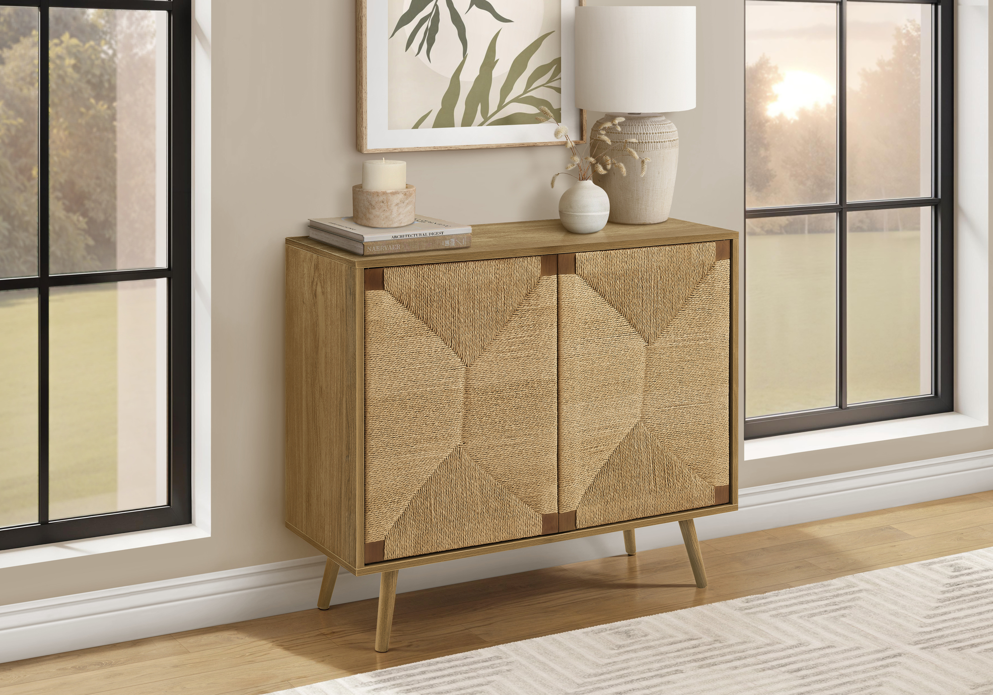This 36″ wide accent chest in a mid-century design and a light walnut laminate finish, features seagrass-look cabinet doors that effortlessly combines decorative elegance with practical storage.