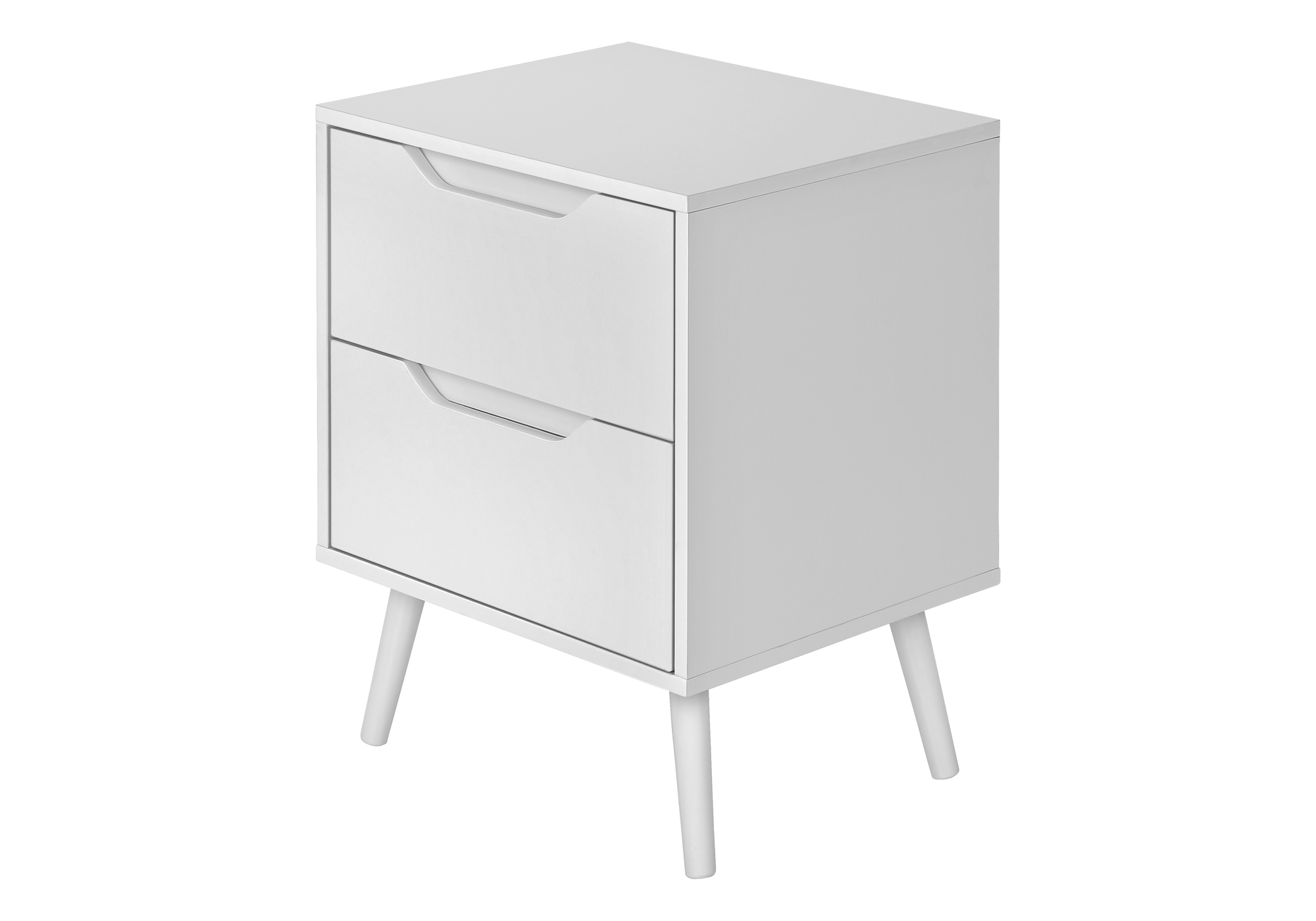 Complement your living space with chic and stylish accent table that perfectly marries mid-century modern design with practical functionality. Standing at 24″ high and finished in a smooth white laminate, this fashionable style side table with a space saving design, seamlessly fits into a contemporary bedroom as a nightstand or as an end table in a living room. Built with solid wood legs and an easy to clean top to withstand daily use, this side table not only enhances your decor but is durably designed to stand the test of time. Tucked beneath its elegant surface are 2 spacious storage drawers with recessed handles, ideal for stowing away your essentials, and maintaining a clutter-free space. This modern end table is easy to assemble with the included illustrated instructions, so you can enjoy your new piece in no time. Plus, our commitment to quality is backed by a 5 year limited warranty against manufacturer defects, giving you peace of mind with your purchase.