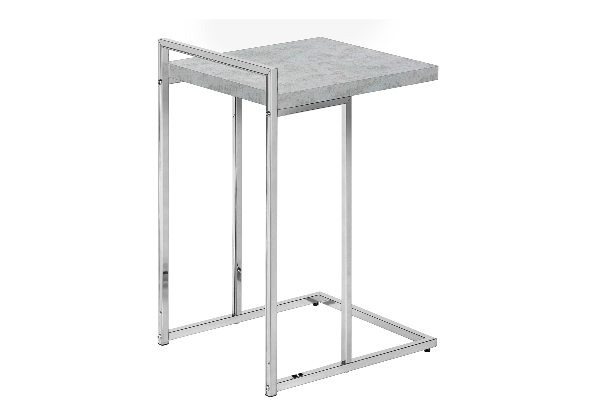 This C-shaped accent table brings something extra to the table. The thick-panel tabletop in a grey cement-look finish offers a wider surface than most standard-size C tables. More surface space gives you more opportunities to use this end table. It can multitask in a living room or bedroom as a snack table when you watch TV, a nightstand to place a mobile phone while you sleep, or even a small laptop table when you need to work. The chrome metal base slides under a sofa or bed to bring items closer to you and offers another convenient feature: The top of the frame extends over the tabletop to create a handle that makes it easier to lift and move this portable side table.