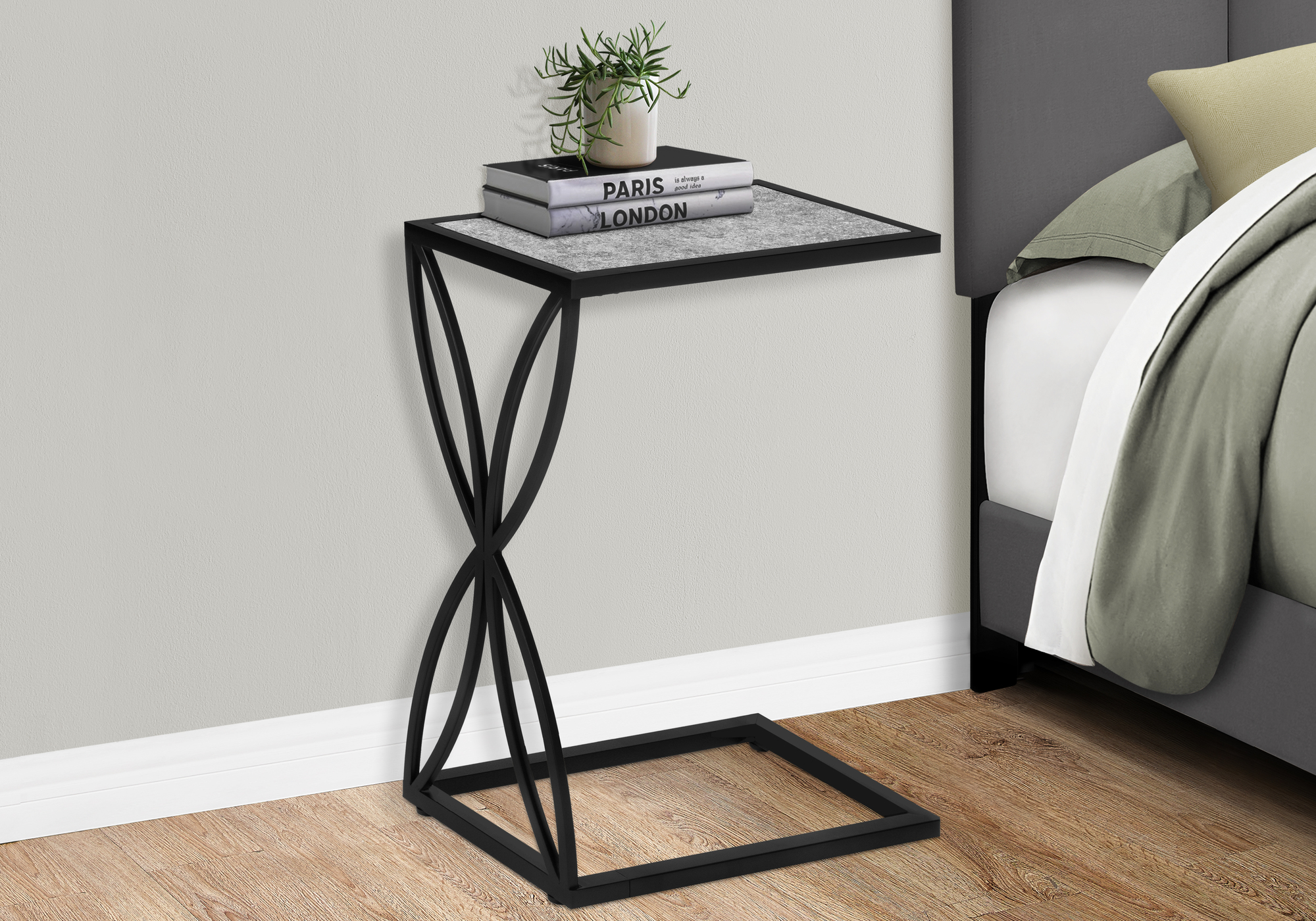 Straight lines join with sleek curves to give this C-shaped accent table a sophisticated look. The rectangular tabletop in a textured, grey stone-look finish is bordered by a black metal frame that extends down to the base. The geometric flower petal design of the frame adds a decorative touch. This versatile end table is ideal for living rooms or bedrooms as a convenient surface to place items like a small clock, remote, or mobile device.