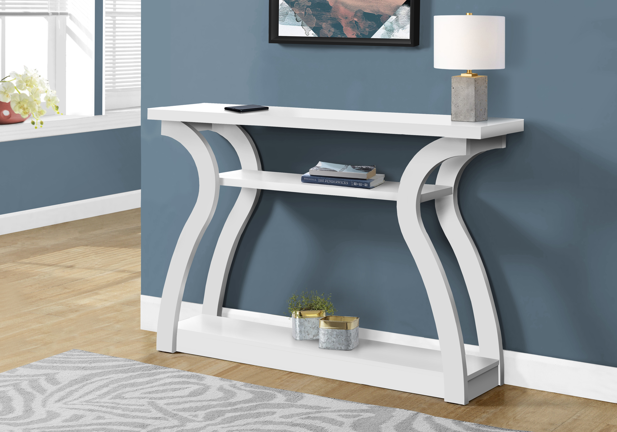 Grab your guests’ attention with this stylish white accent console table. Featuring a unique curved base and a three tiered open concept design, this modern unit is perfect for dressing up any wall in your home or displaying your favourite decorative items.