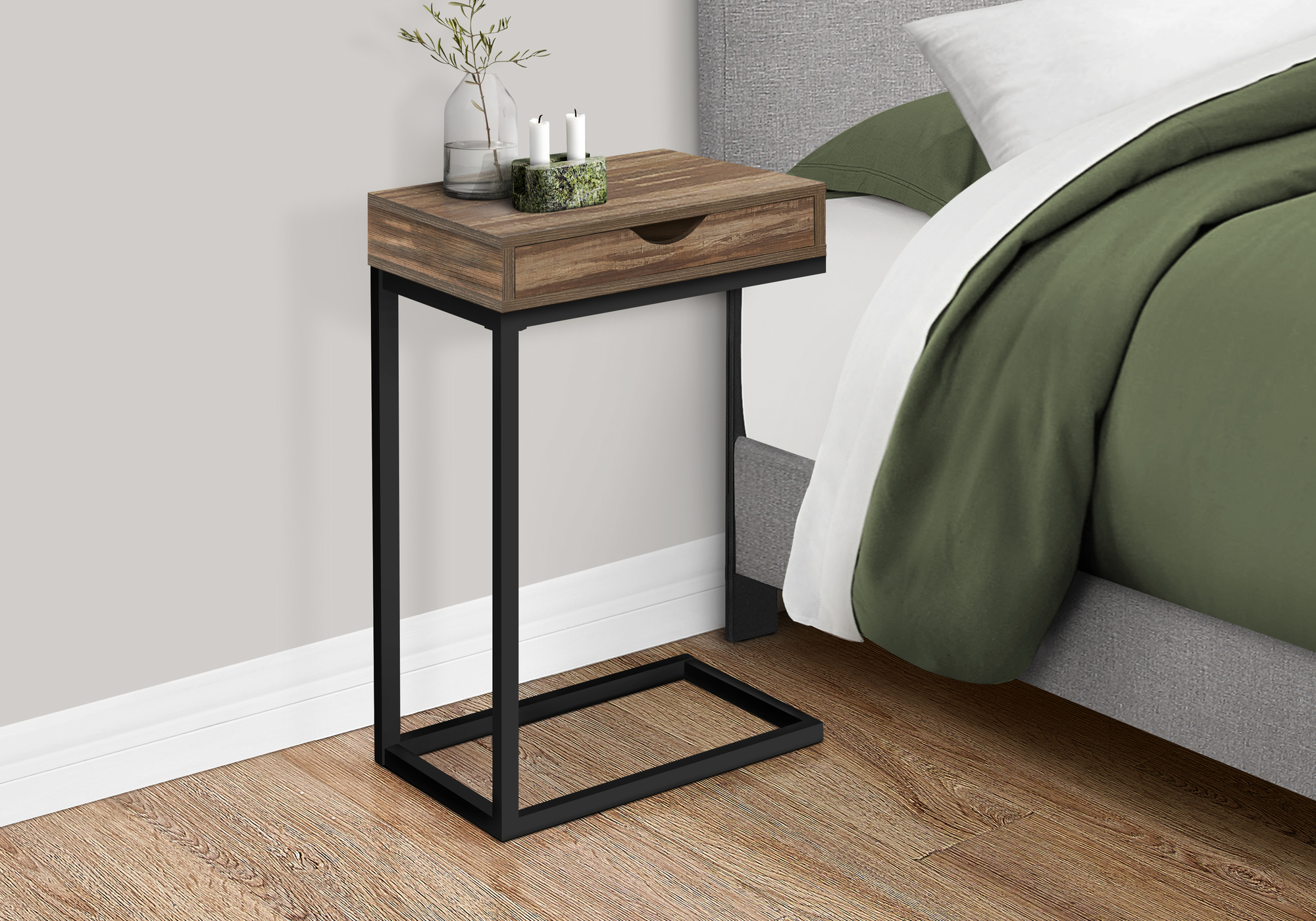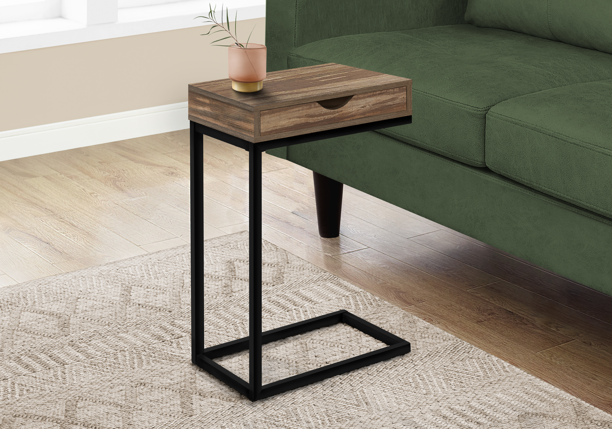 Tired of holding a beverage in your hand and a bowl of popcorn in your lap while binge watching? This C table keeps them within easy reach so you can sit back and enjoy the show. The C-shaped base slides under your sofa or chair, placing the table surface close to you. For added convenience, the top includes a storage drawer that is accessible from both sides. Use it to hide away mobile devices to avoid interruptions while you’re watching TV, then store remotes in it when you’re done. Stylish and versatile, this portable accent table features a top in a brown reclaimed wood-look finish and a metal frame in black that adds a modern look wherever you need a small side table with storage.