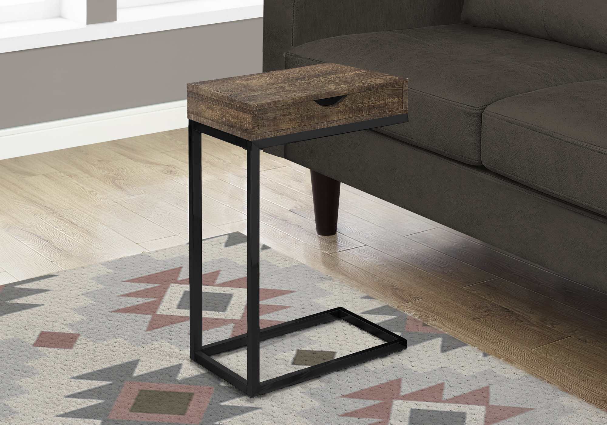 With a whole lot of classiness, this industrial C shape side and end table also comes with all the practicality you need. An ideal fit alongside your sofa or bed, the accent table is perfect for your small home, apartment or condo and will surely bring more jazz to your movie night, study session or quiet time. Featuring a trending brown reclaimed wood look, the sturdy black metal base sits slightly off the ground to prevent damage to your floor. Don’t forget a convenient storage drawer for any living room accessories such as remotes, coasters, magazines or more. Make this your new favorite living room piece.