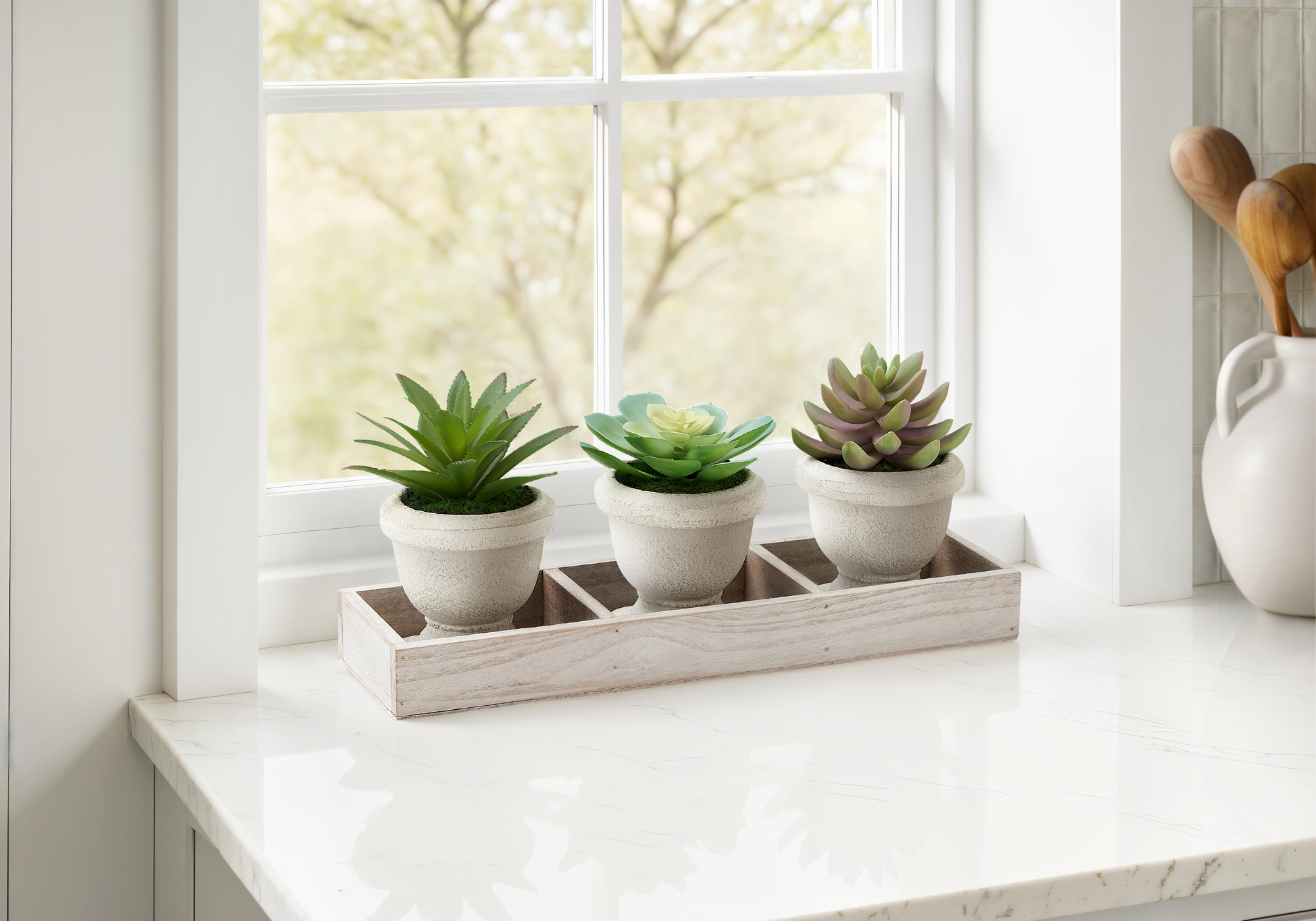 Bring effortless charm and structure to your décor with this set of 3 artificial succulent plants, designed as a refined accent for the home or office. Standing 6″ tall, each artificial plant is perfectly scaled for a table, console, or desk, adding greenery without overwhelming your space. Each succulent is placed in a softly textured beige pot and arranged in a coordinating light wood tray with divided compartments, creating a clean, organized display. Crafted from high-quality materials, the varied foliage offers a carefully detailed realistic look, capturing the natural beauty of live succulents while requiring no maintenance no watering, sunlight, or care needed. Made with environmentally friendly materials and backed by a 5-year limited warranty, this artificial plant set delivers long-lasting quality, sustainability, and peace of mind. It’s a simple, stylish way to add warmth and greenery to modern interiors without the commitment of live plants.