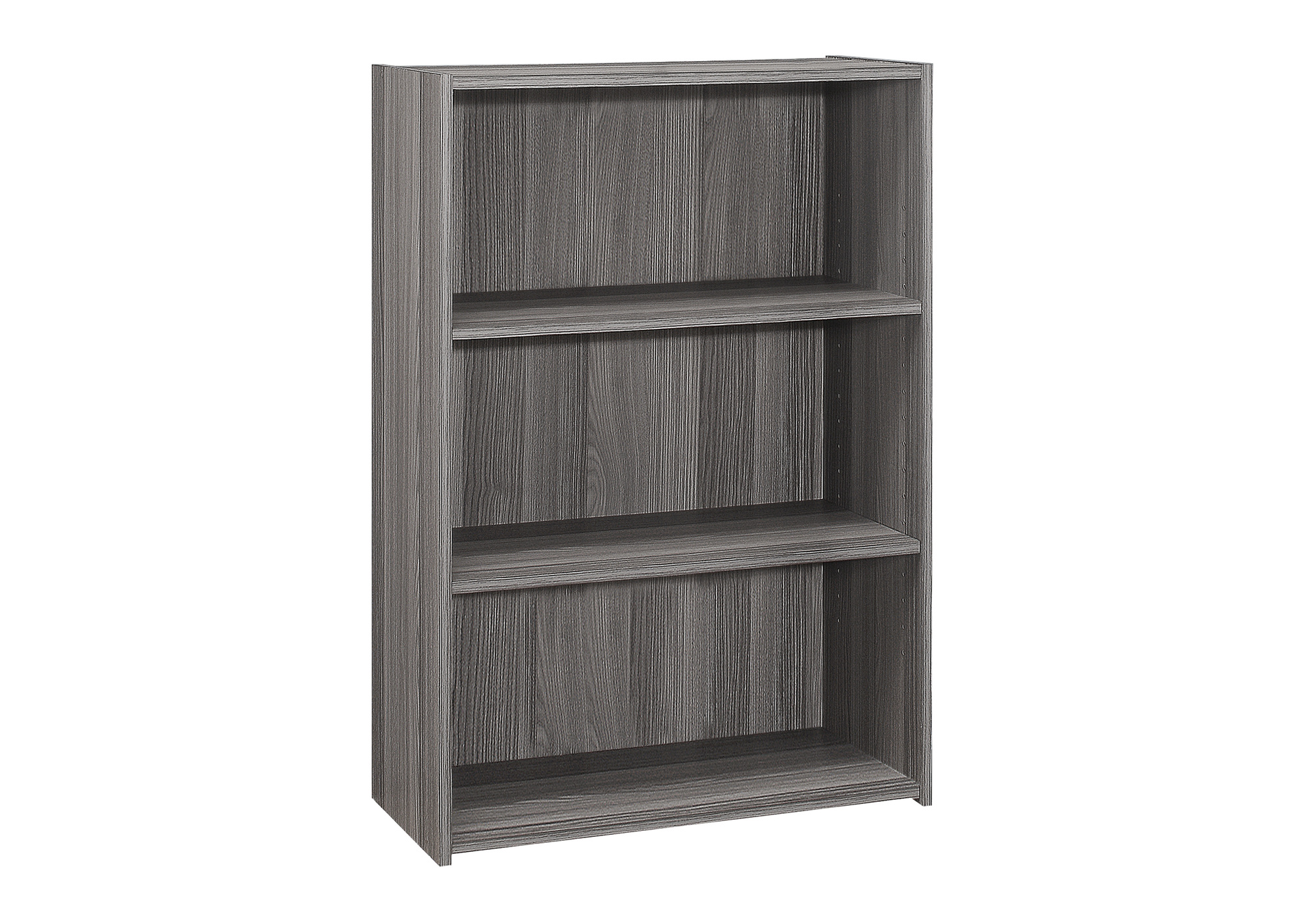 This 3-shelf bookcase in a simple, clean and space-saving design makes it a versatile storage option for any room in your home. The solid adjustable shelving allows for various sized objects to be displayed in your own creative way. Constructed from engineered materials in a sophisticated grey wood-look laminate finish, this transitional style bookcase could be used in an entryway to store all your shoes, or in a living room, home office, or bedroom to place books, toys, and decorative objects. Assembly is required.