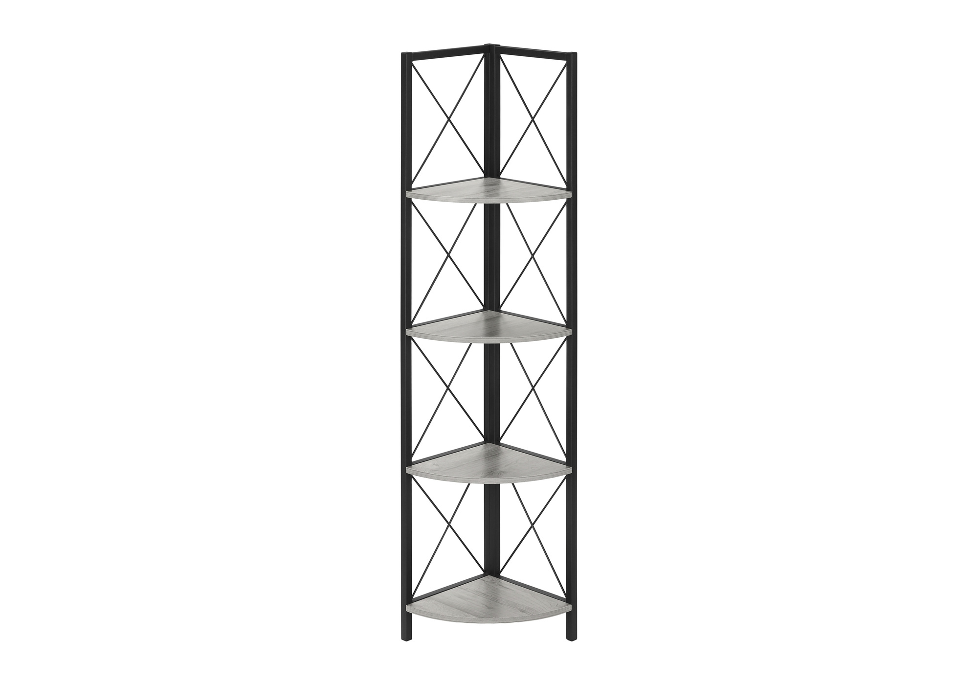 Perfect for photo frames, plants, other decorative items and even kitchen accessories, this transitional-style corner bookcase will upgrade your decor. Including 4 grey wood-look display shelves, this corner display unit features a three-leg black metal frame and a X-Design to add modern flare wherever you choose to place it. This corner etagere bookcase is sure to impress. Assembly is required.