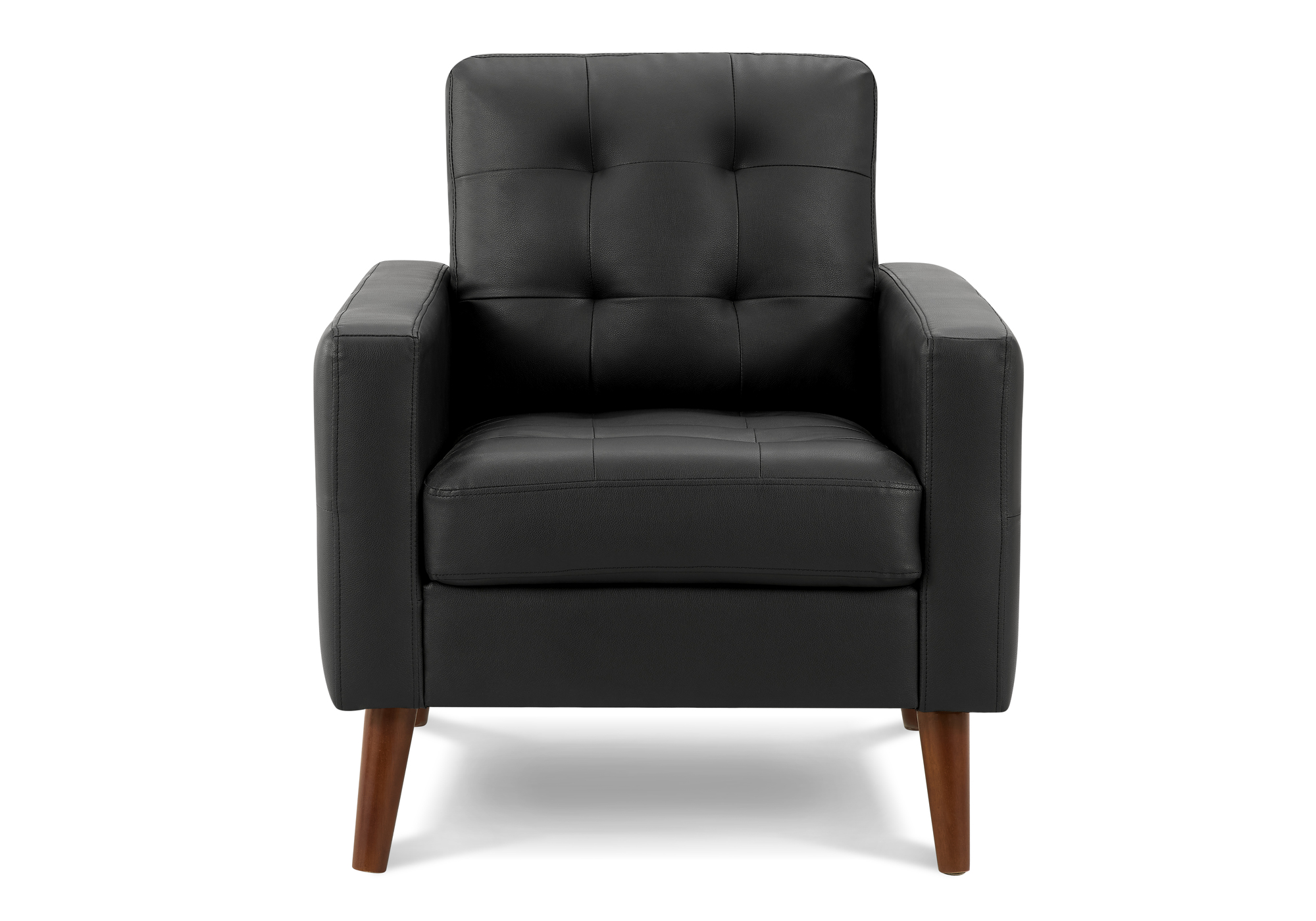 Make your living space feel complete with this stunning 31″ wide black leather-look accent chair the perfect blend of style and comfort. Designed with modern sophistication, its sleek upholstery complements both mid-century and contemporary décor with ease. A foam-filled cushion with pocket coil seating delivers comfortable, durable support, making it ideal for relaxing after a long day or enjoying a good book in your living room or bedroom. Solid wood legs in a rich walnut finish add lasting durability and a refined touch of warmth. Assembly is quick and simple, so you can enjoy your new chair sooner, and a 1-year limited warranty offers added peace of mind.