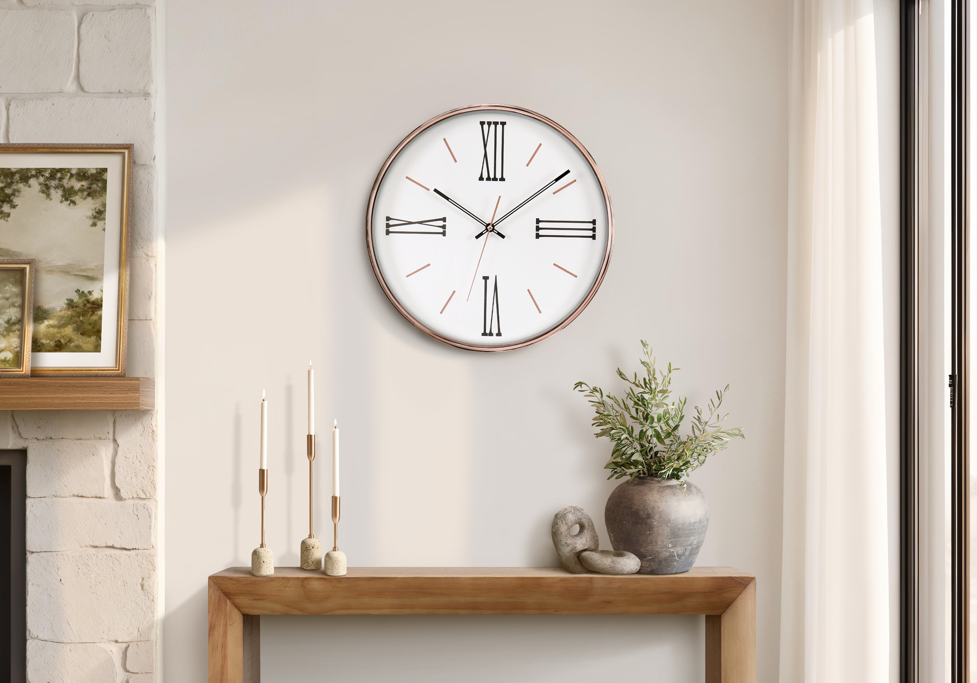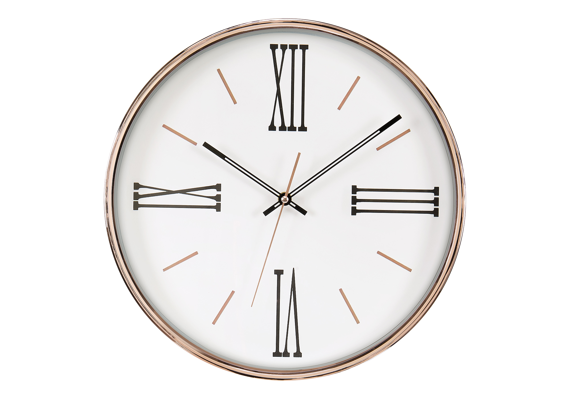 Discover a new standard in elegance with this beautiful 14″ round wall clock, a perfect blend of style and functionality for transitional home decors. This decorative accent features a chic plastic gold frame that adds a touch of luxury to any space, while its easy to read design under the glass surface showcases classic roman numeric markings on a pristine white background. This non-ticking wall clock operates with precision thanks to its quartz movement to deliver accurate timekeeping at a glance in a serene environment. With no assembly required, this analog clock simply needs 1xAA battery to effortlessly hang this striking timepiece. A 2-year limited warranty against manufacturer defects is included for your confidence, for a long-lasting, quality made product. For indoor use only.