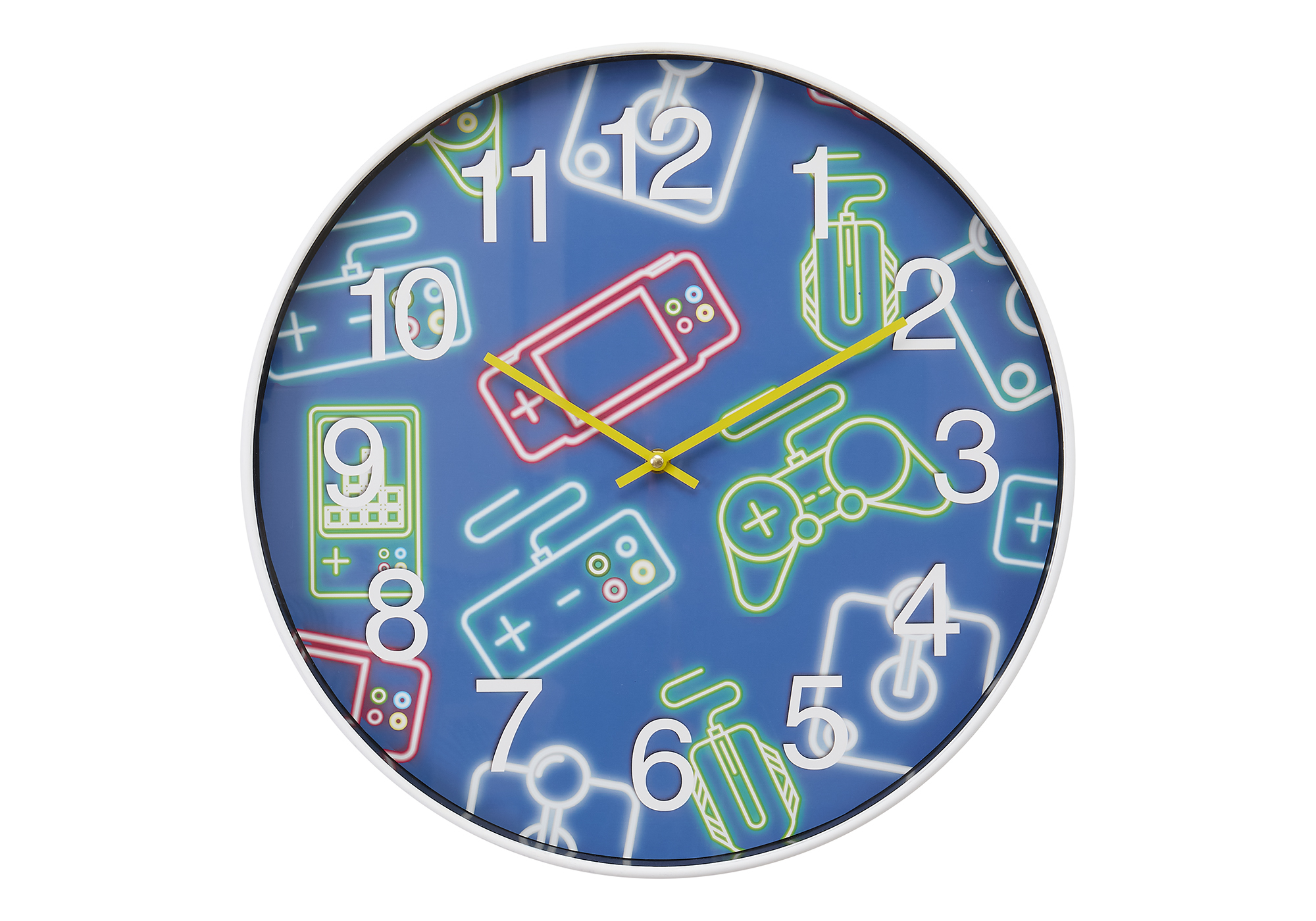 Introduce a splash of color and fun to your child’s room with our vibrant 18″ round wall clock! Designed for juvenile spaces, this contemporary analog clock combines modern aesthetics with practical functionality. Housed in a sleek white plastic frame and featuring a delightful multi-colored face, this clock is more than just a timepiece, it’s a statement piece for home decor that sparkles with personality! With accurate timekeeping powered by quartz movement, your kids will never miss a beat. No assembly is needed, simply insert 1xAA battery (not included) and it’s ready to go. The easy to read numerical display with a gaming printed motif under the glass surface add playful yet functional art. Plus, the non-ticking feature guarantees a peaceful environment during homework or bedtime, making it ideal for indoor use only. This decorative wall clock is a must-have bringing a touch of magic to a youthful space.