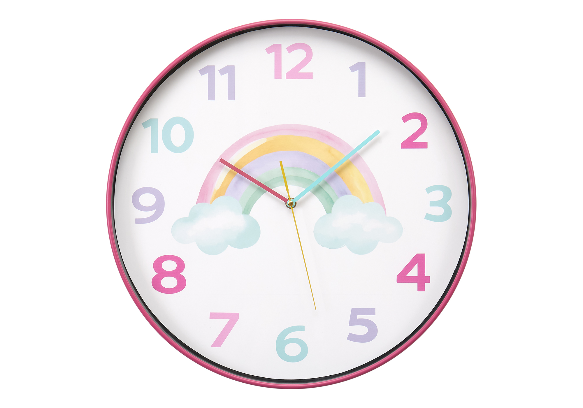 Here is a fun way to teach your kids how to tell time and transform their room decor. This colorful and whimsical 18″ round wall clock makes a cute eye-catching addition that your kids will adore! This vibrant contemporary wall clock features a playful multi-colored face and easy to read numeric display so they can learn to tell time with confidence. Designed with a sweet pink frame that complements any juvenile setting, this decorative piece effortlessly enhances your child’s bedroom or playroom aesthetics. With its non-ticking quartz movement, you’ll experience accurate timekeeping without any distractions, making it perfect for quiet or study time. Protected with a sleek glass surface and a durable plastic frame, this wall clock is designed to withstand the energetic lifestyle of children. Plus, there’s no assembly required, just insert 1xAA battery (not included), and watch it spring to life! Backed by a 2-year limited warranty, you can trust the longevity and quality of this charming analog timepiece. For indoor use only, add a splash of color and charm to your little one’s room with this cheerful wall clock with a rainbow print, where every glance at the time becomes a delightful experience!