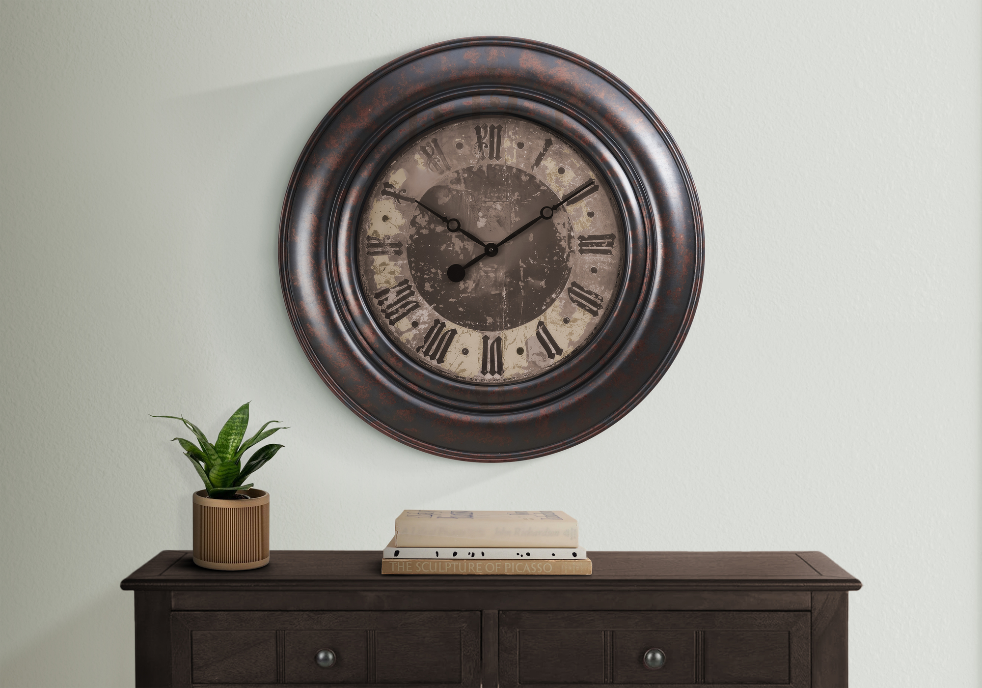 Introducing this 30″ round wall clock in a beautiful rustic brown finish. This large oversized clock is the perfect statement piece for any trendy home decor. The classic roman numeric analog display against an old-world printed background is easy to read, while the non ticking quartz movement ensures accurate timekeeping in a peaceful environment. Crafted with a durable plastic frame and a sleek glass surface, this clock is not only decorative but also built to last. With no assembly required and only requiring 1 AA battery (not included), this accent clock is easy to hang and enjoy right out of the box. Suitable for indoor use only, this clock includes a 2 year limited warranty against any defects, so you can trust in its quality and longevity. Add a touch of sophistication to your living room, hallway, or a stylish accent to your bedroom with this impressive transitional-style clock, perfect for fashion-forward decors.