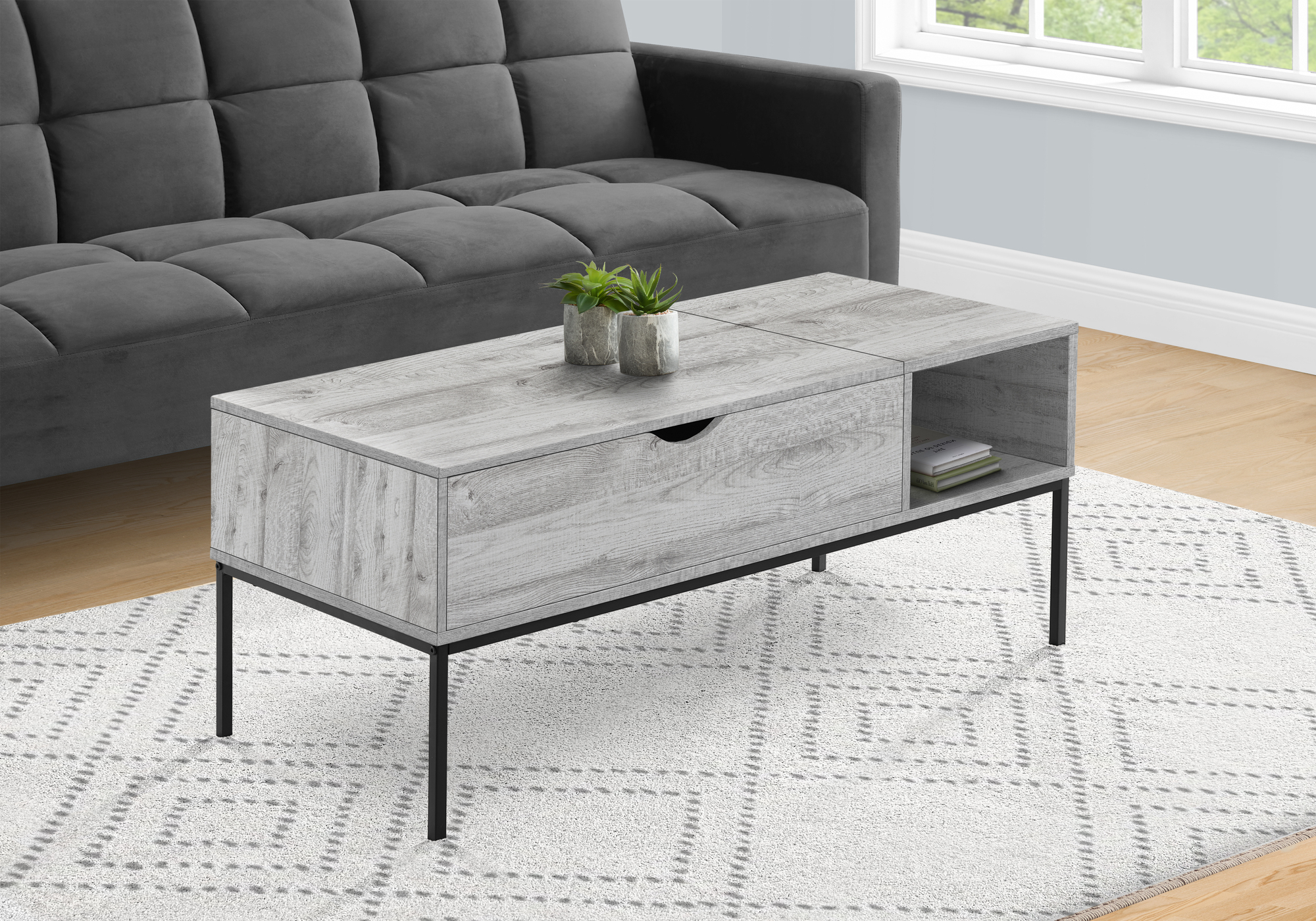 This contemporary style, 42″ long rectangular coffee table with storage, a wood-look laminate grey finish on all sides and a sleek black metal base will be a modern standout in your living space.