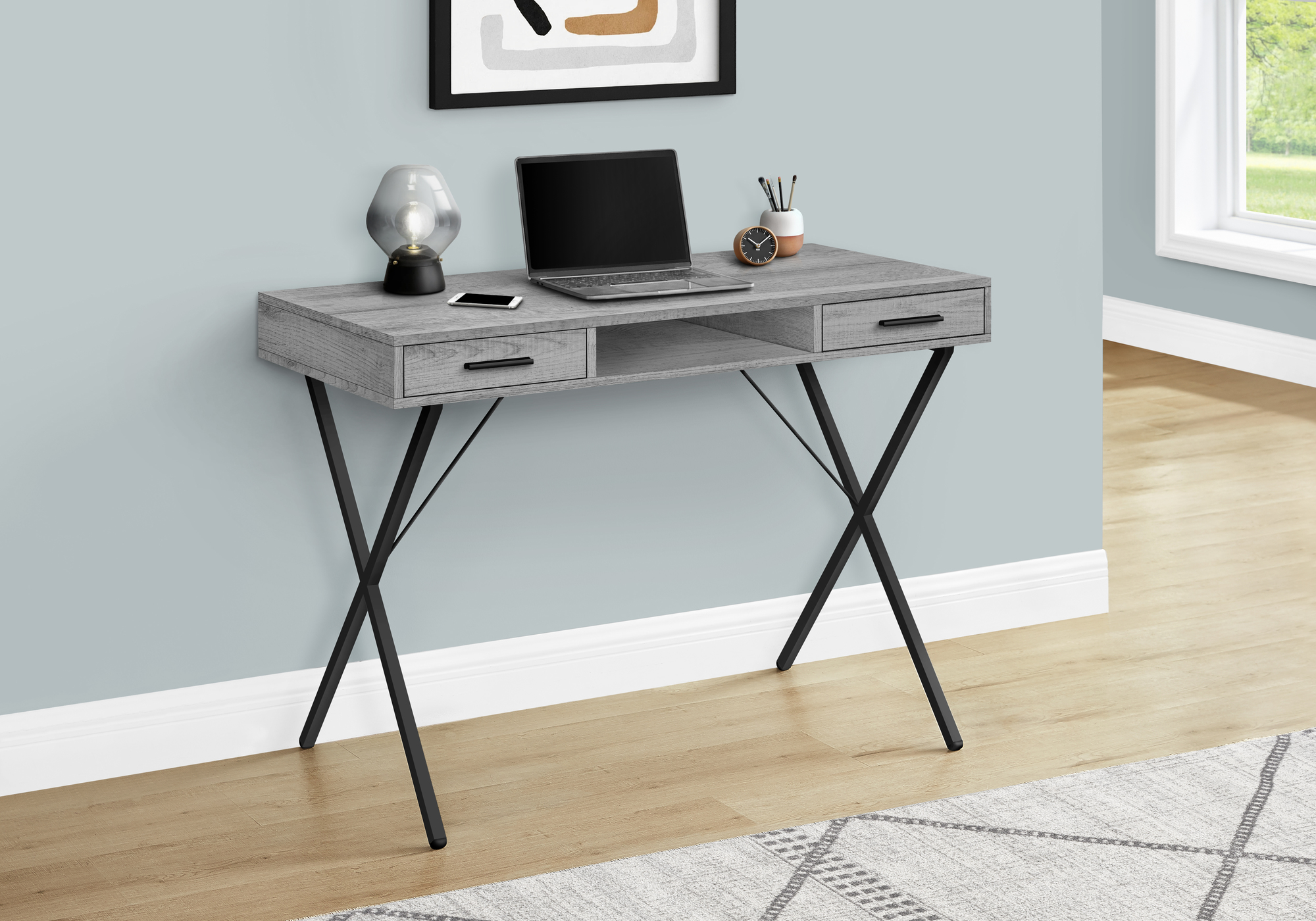 This widely versatile industrial style desk finished in a grey wood-look laminate is equally functional as a computer desk, writing table or study center. Sized for small homes, apartments or condos, space saving is a breeze thanks to this piece that is supported by a sturdy black metal X-shaped trestle legs to ensure stability and a comfortable work environment. This office desk is equipped with two convenient and easy-open storage drawers for all you need to store away while not in use. With lots of space to push the chair in, the desk is compact, while the desktop has the perfect amount of surface space for a laptop/tablet, lamp, notebook and some important supplies to get the job done.