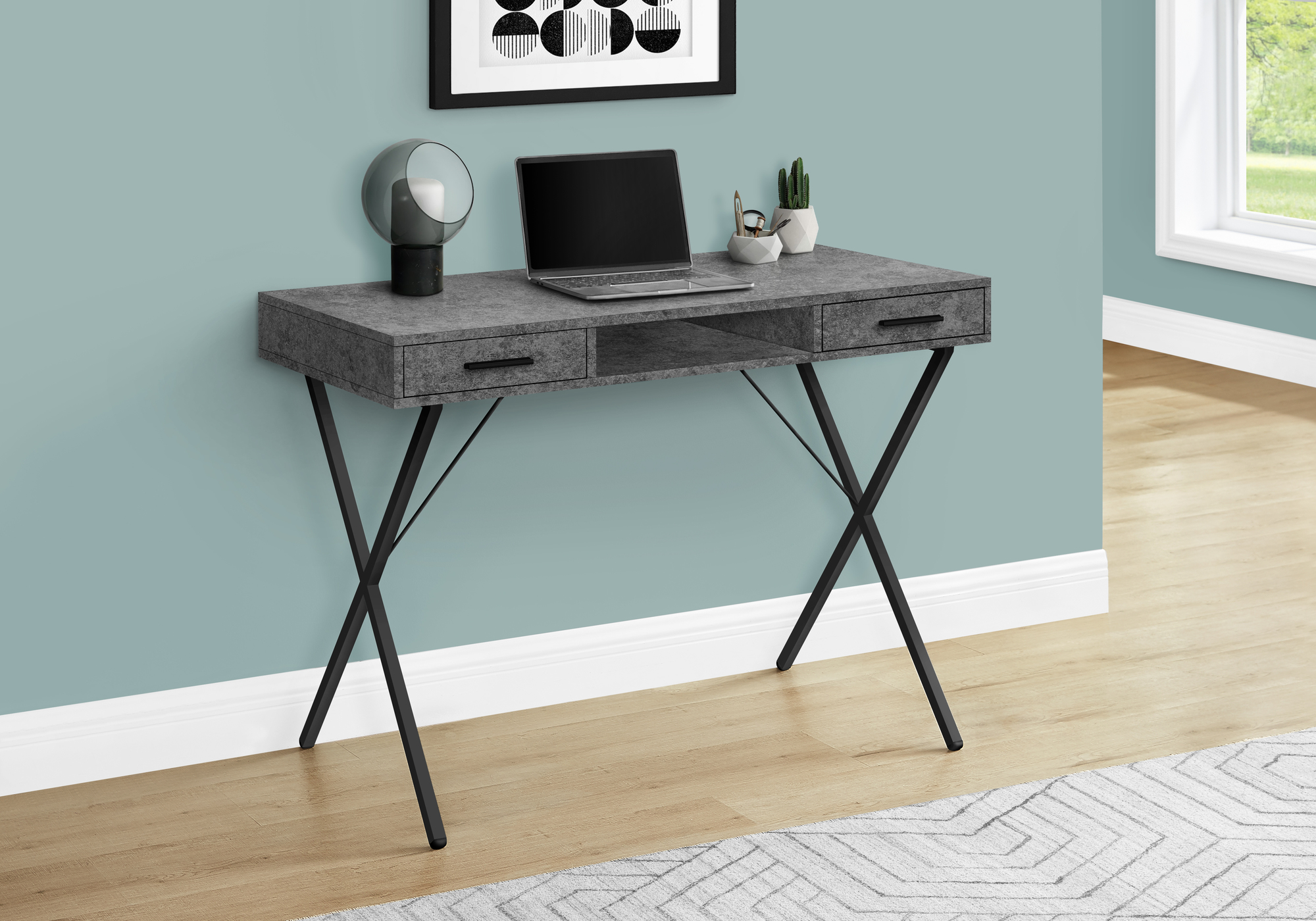 This widely versatile industrial style desk finished in a grey stone-look laminate is equally functional as a computer desk, writing table or study center. Sized for small homes, apartments or condos, space saving is a breeze thanks to this piece that is supported by a sturdy black metal X-shaped trestle legs to ensure stability and a comfortable work environment. This office desk is equipped with two convenient and easy-open storage drawers for all you need to store away while not in use. With lots of space to push the chair in, the desk is compact, while the desktop has the perfect amount of surface space for a laptop/tablet, lamp, notebook and some important supplies to get the job done.