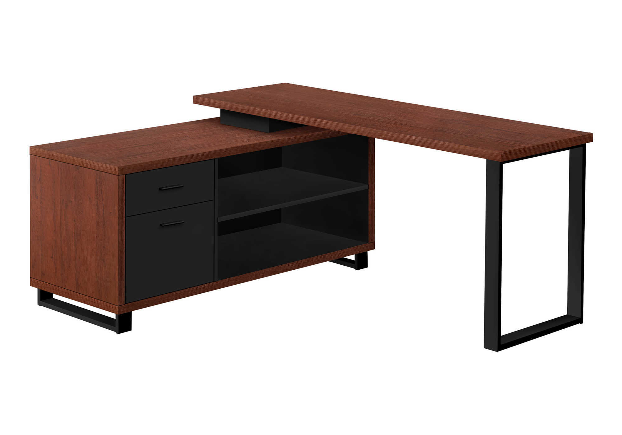 This stunning executive L-shaped desk will add style to any office space. Finished in cherry wood-look, it boasts two storage drawers and two open shelves finished in black, which serve to accentuate its modern and minimalist design. The two-tiered work top provides a large work area and ample space to store your office essentials, and a solid black metal leg provides a stable base. The perfect computer desk for your home office, this spacious workstation elegantly combines a two-tone finish that your friends and colleagues will admire. Staying organized at home has never been so easy and fashionable!