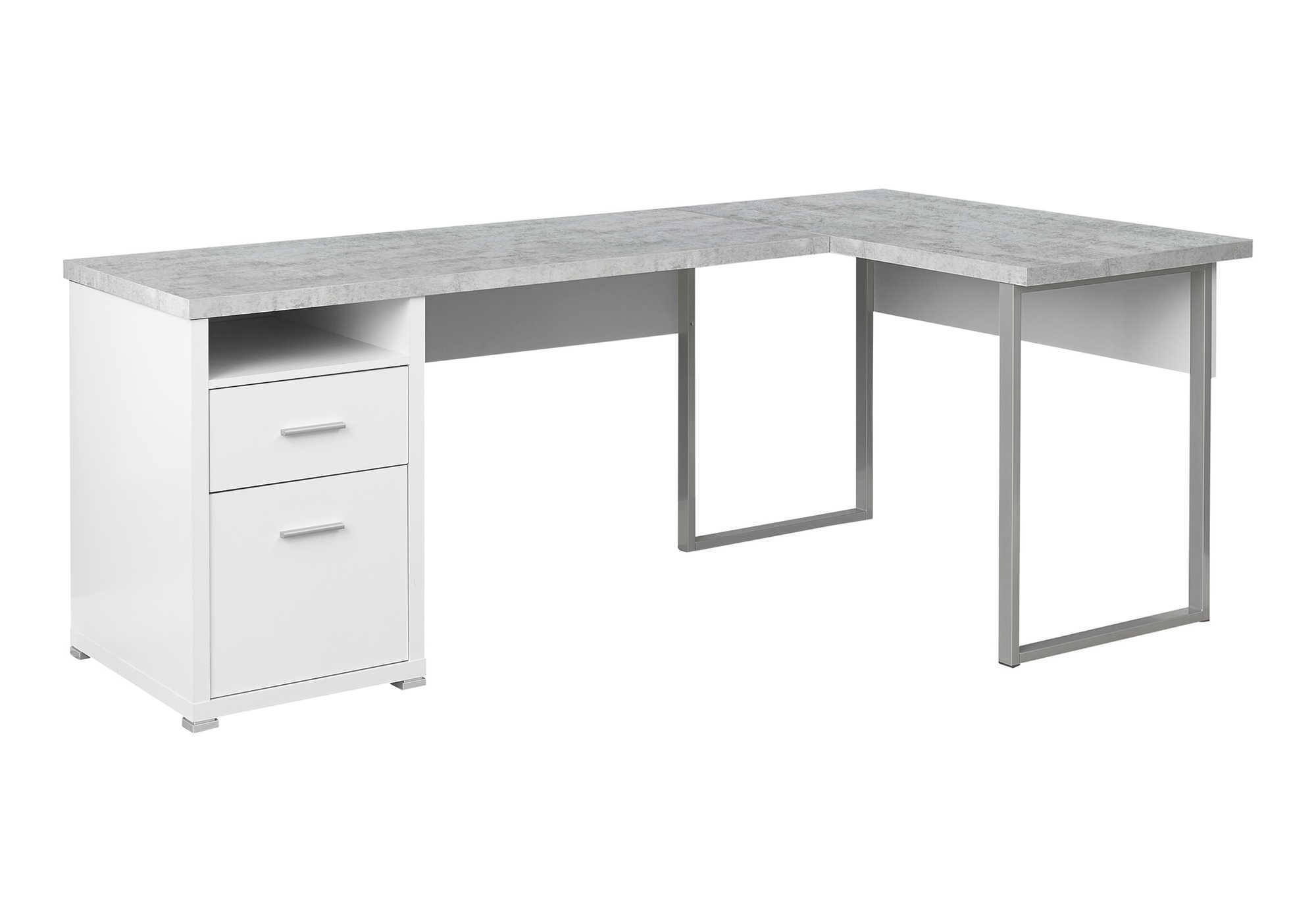 “L” stands for more than just the shape of this computer desk. It stands for “lots” of convenience and room to work. This 80″L corner desk in a white and grey cement-look laminate finish on all sides has a reversible configuration, so you can set up the storage side of the desk on the left or right according to your preference. Offering plenty of closed storage with 2 storage drawers that includes a file drawer for letter or legal sized folders and documents, and an open cubby shelf helps to keep the desktop clutter free. Durably designed, the easy to clean top is supported by robust, rectangular grey metal legs in a contemporary style. Easy to assemble with full, illustrated instructions included and we back this desk with a 5 year limited warranty against manufacturer defects for your satisfaction. Create a functional workspace with fashionable style in your home office with this modern desk that accommodates all your work and study needs.