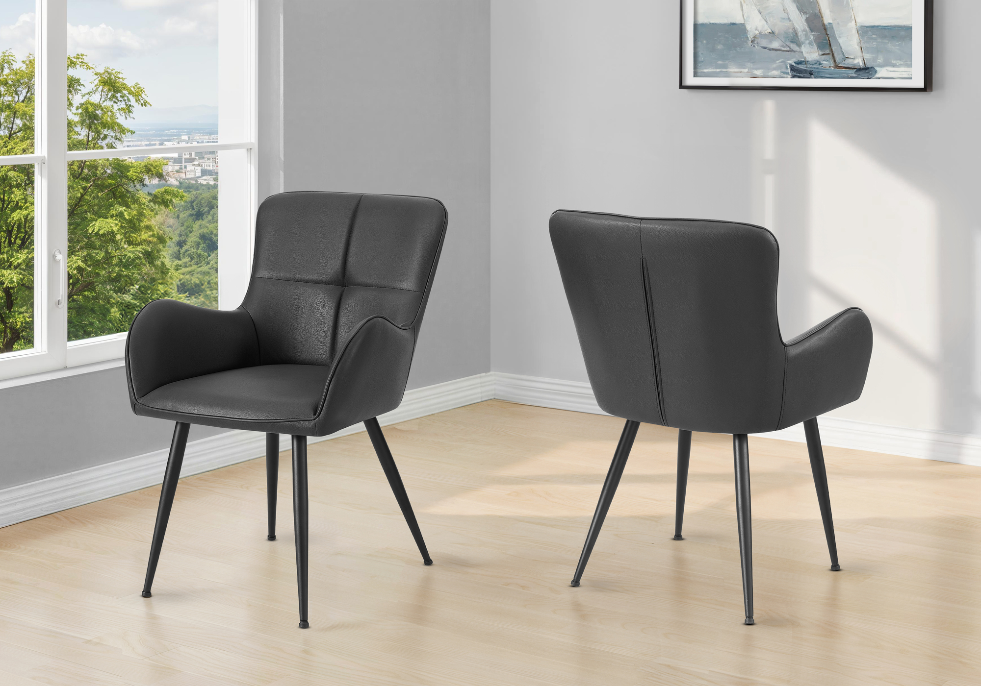 Add a modern touch to your dining room or kitchen with this set of 2 dining chairs, featuring plush, black leather-look upholstery and sturdy black metal legs that effortlessly blend style and functionality.