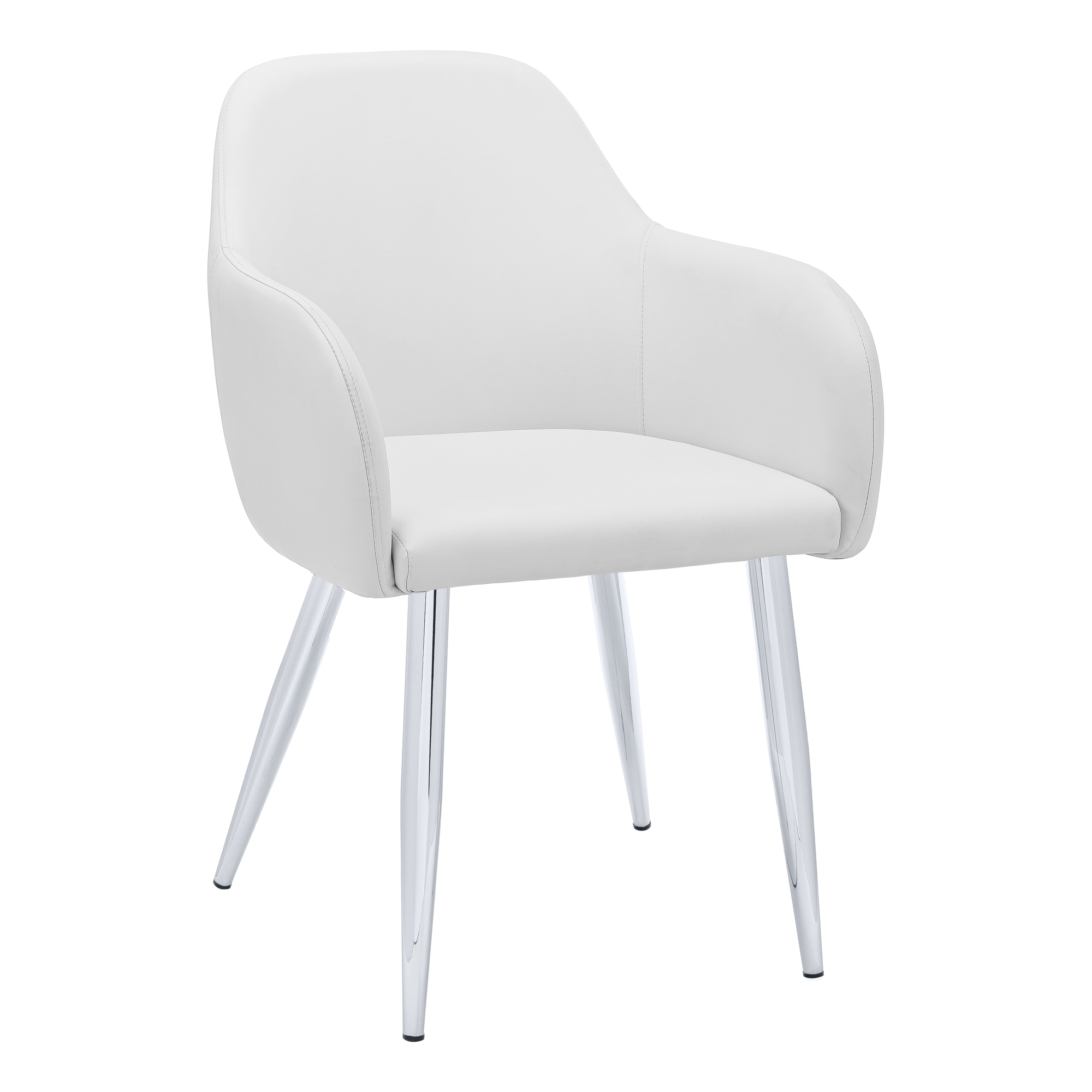 No need to rest your elbows on the table as these dining chairs with armrests provide a convenient place to put them while seated. Designed so that the chairs can be pushed in when not in use, the integrated armrests are set to the perfect height while sleek and comfortable. Upholstered in a white leather-look fabric with minimal stitching for a clean look, the padded back and sides curve around the cushioned seat for a soft feel. Angled and tapered chrome metal legs add a stylish appeal. Sold as a 2-piece set, these chairs have a modern-meets-retro style ideal for an eat-in kitchen or formal dining room, or as accent chairs in other rooms.