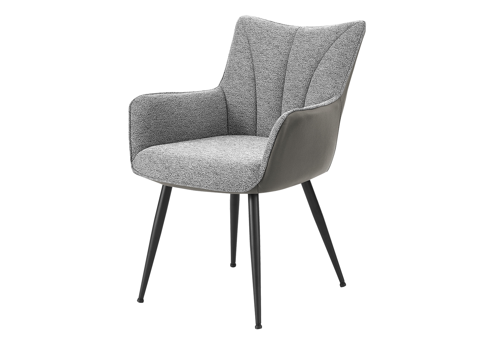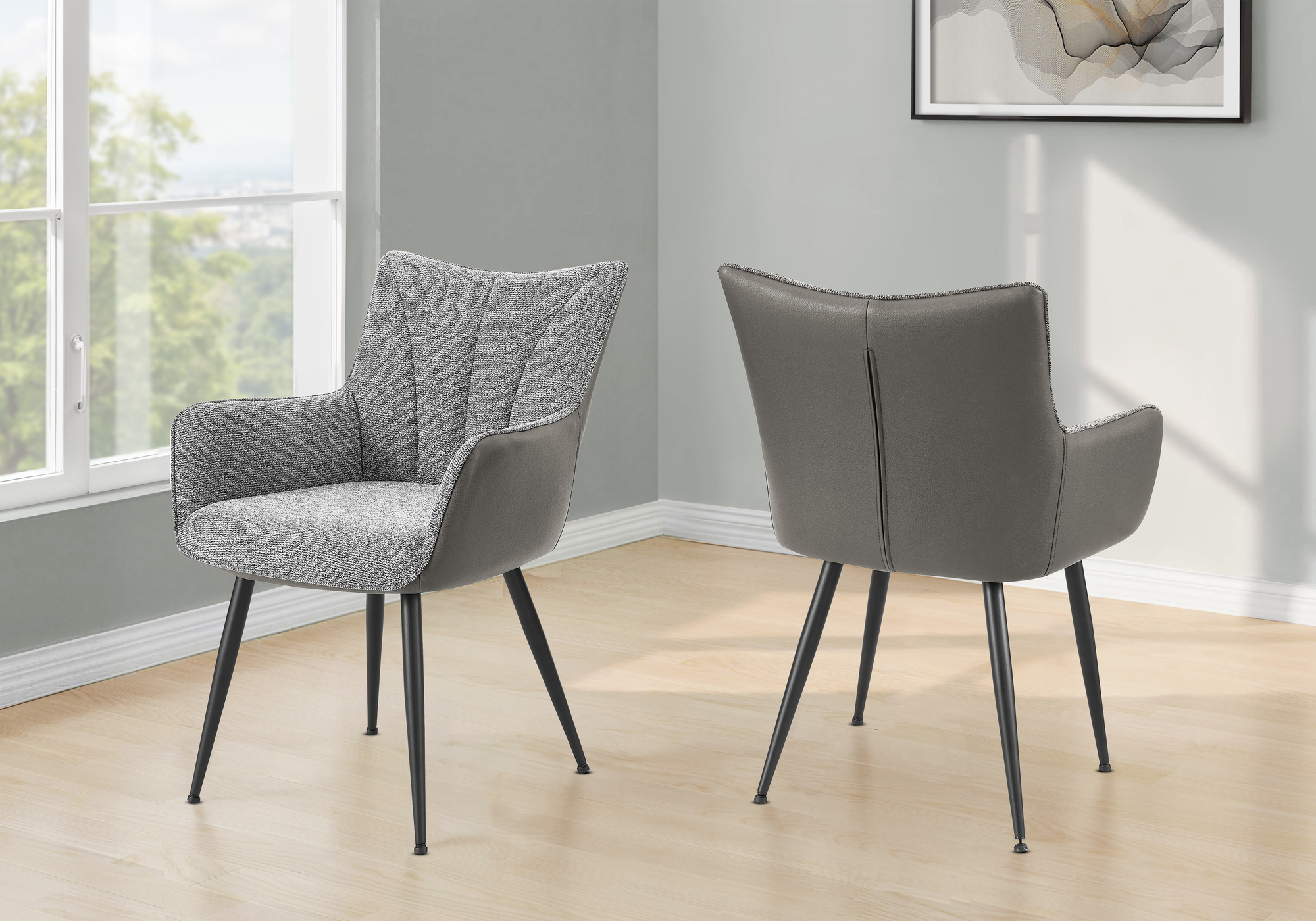 Get ready to dine in style with this set of 2 modern dining chairs, designed for the trend savvy customer who values practicality with comfort. With a fashionable style, these 34″ high side chairs are perfect for casual family dining and entertaining. Crafted with durable materials, these chairs feature sleek grey leather-look upholstery along the back exuding sophistication, while the front of the chairs are upholstered in a light grey fabric, adding a warm touch in any contemporary dining room or kitchen. The sturdy construction of the black metal legs offer solid stability and support for daily use. Sink into the luxurious foam cushioning provided by the padded seats, sides arms and channel tufting on the back rest for both style and maximum comfort. Designed to be easy to assemble with illustrated instructions and all hardware provided, make for a simple, hassle-free setup. Plus, a 2-year limited warranty against manufacturer defects is included, ensuring you have reliable seating for years to come.