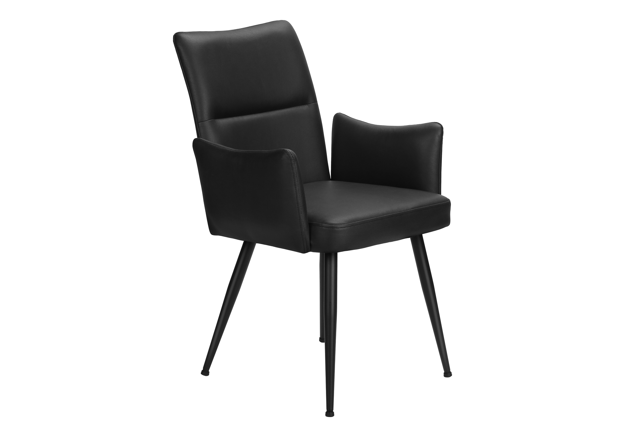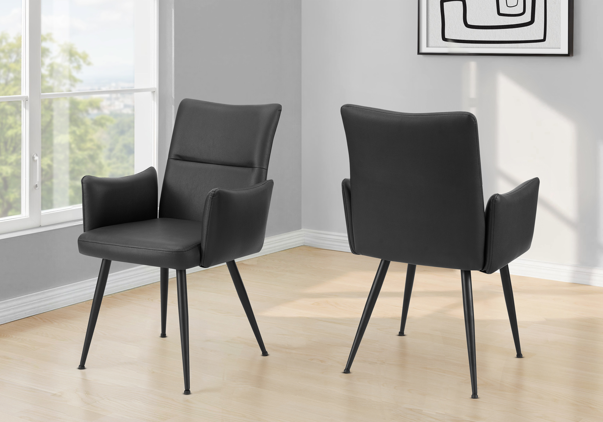 Experience stylish dining with this contemporary set of 2 dining chairs, featuring sleek black leather-look upholstery and sturdy black metal legs, perfectly suited for modern kitchens and dining rooms.