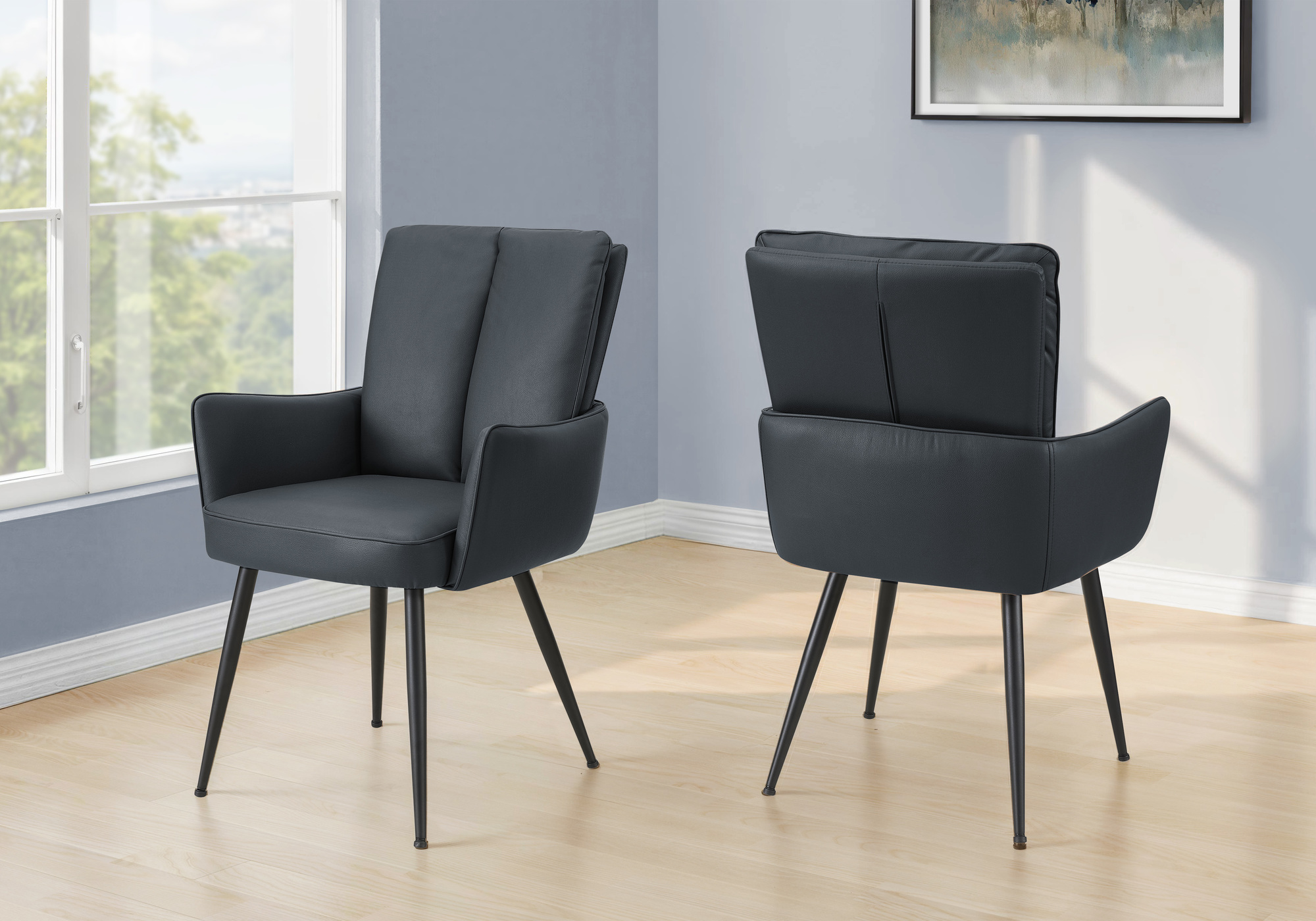 Introducing the ultimate blend of comfort and contemporary design with this set of 2 dining chairs, meticulously crafted to enhance your casual family dining or when entertaining. Standing tall at 36 inches, these stunning chairs boast a fashionable style that complements both modern kitchens and dining rooms. Dressed in a sophisticated blue leather-look upholstery, these chairs are not only stylish but also incredibly durable with sturdy construction. The sleek black metal legs provide a solid foundation that is as robust as it is fashionable. The plush foam cushioning along the back and sides, with thick padded seats ensure that every meal becomes an enjoyable experience. Designed with an easy to assemble mindset that includes illustrated instructions and all hardware to setup and use in no time. Rest easy with our 2 year limited warranty against manufacturer defects for peace of mind as you enjoy the comfort and quality of these gorgeous dining chairs.