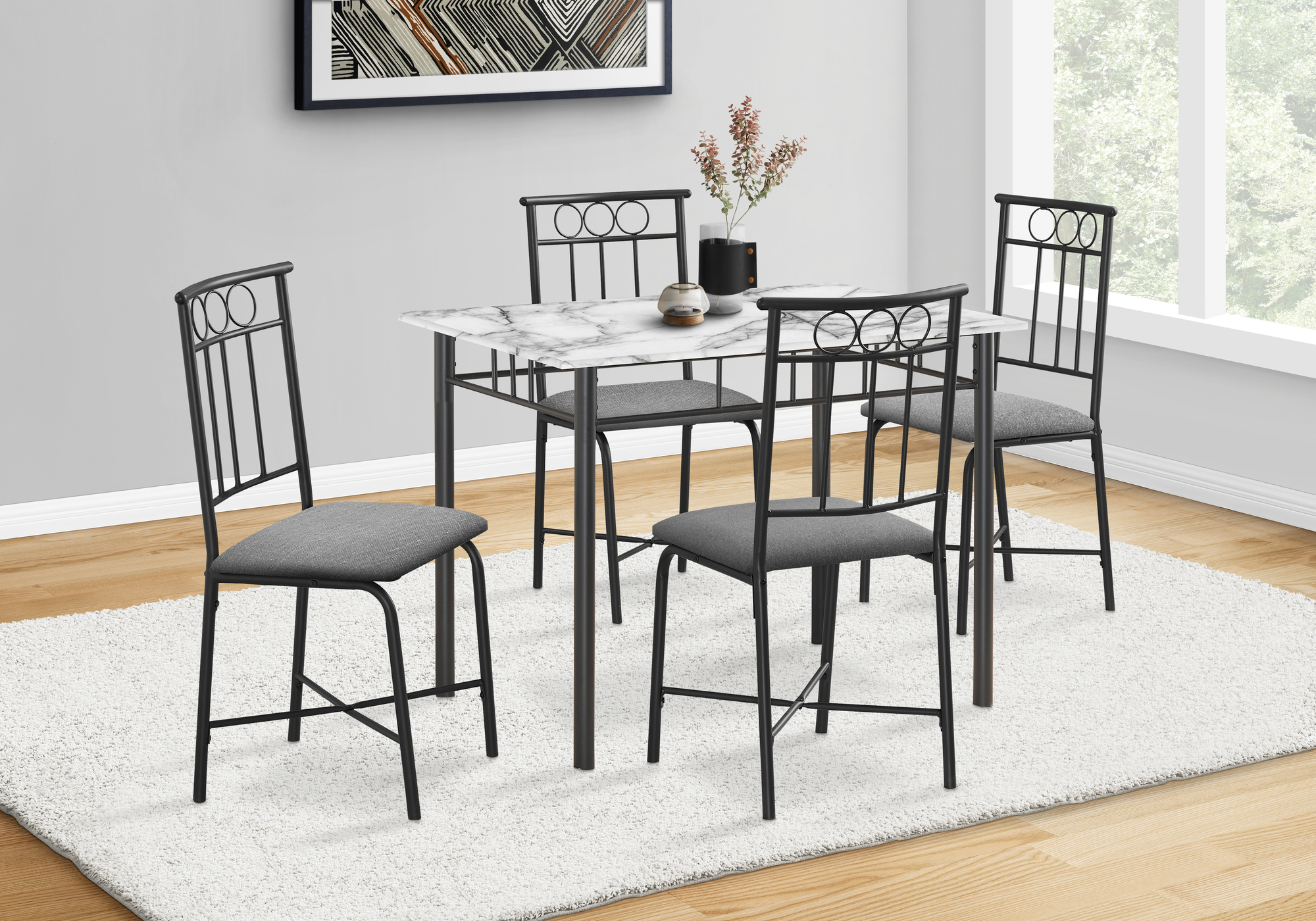 Welcome a casual family dining experience with this modern 5 piece set dining table set! It features a 40″ rectangular dining table with a stunning white marble look laminate top and a sturdy black metal base for a chic contemporary style. Perfect for a small kitchen or dining area, this space saving set easily accommodates up to 4 people. The armless chairs are upholstered in a thick grey cotton and linen mix fabric with matching black metal accents to provide comfortable seating for any meal. Easy to assemble with illustrated instructions and hardware included, this dining set also comes with a 2 year limited warranty against manufacturer’s defects to ensure your satisfaction. Enjoy a fashionable, reliable, and easy to clean dining table set that will last through many dinner parties and family meals.