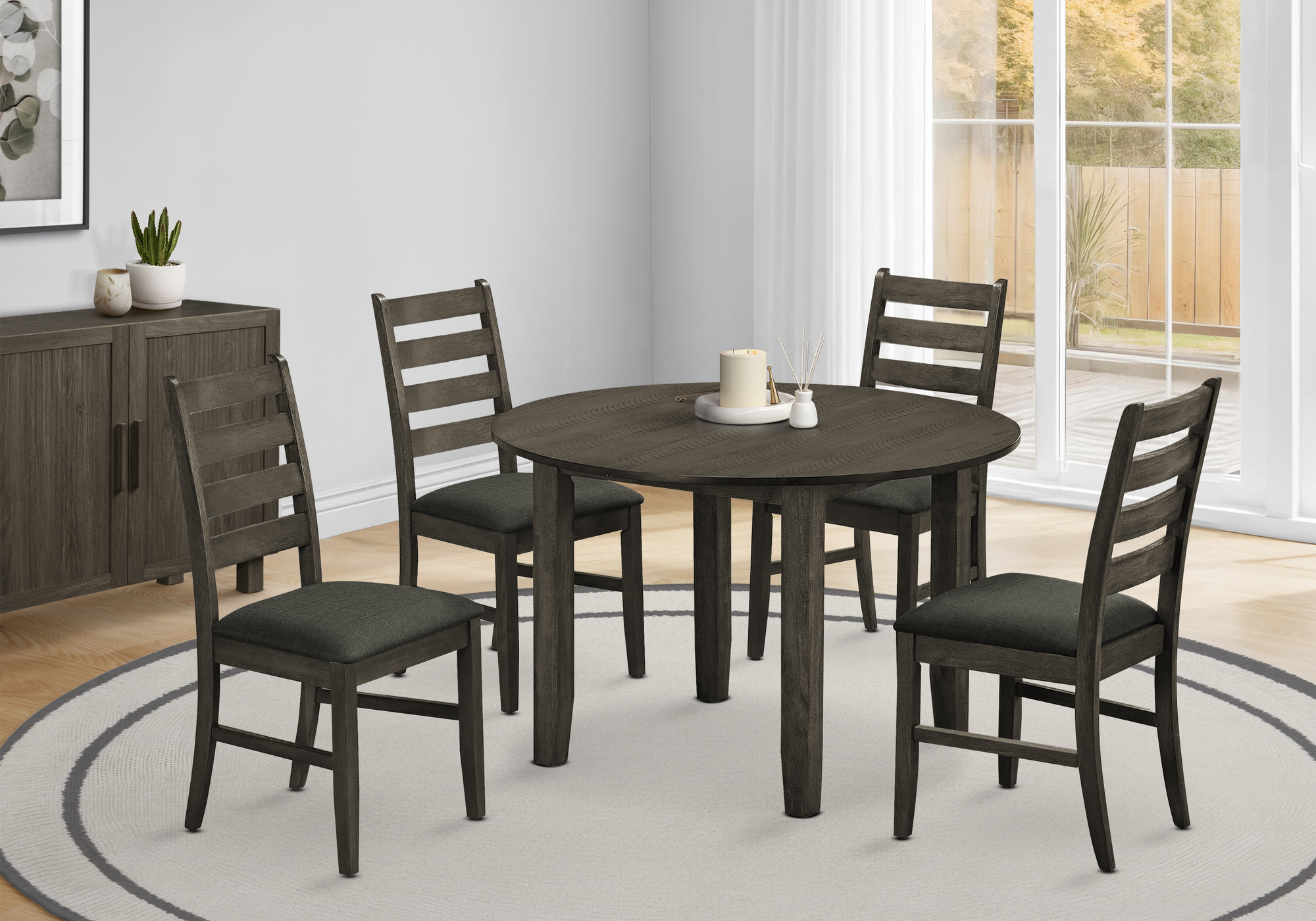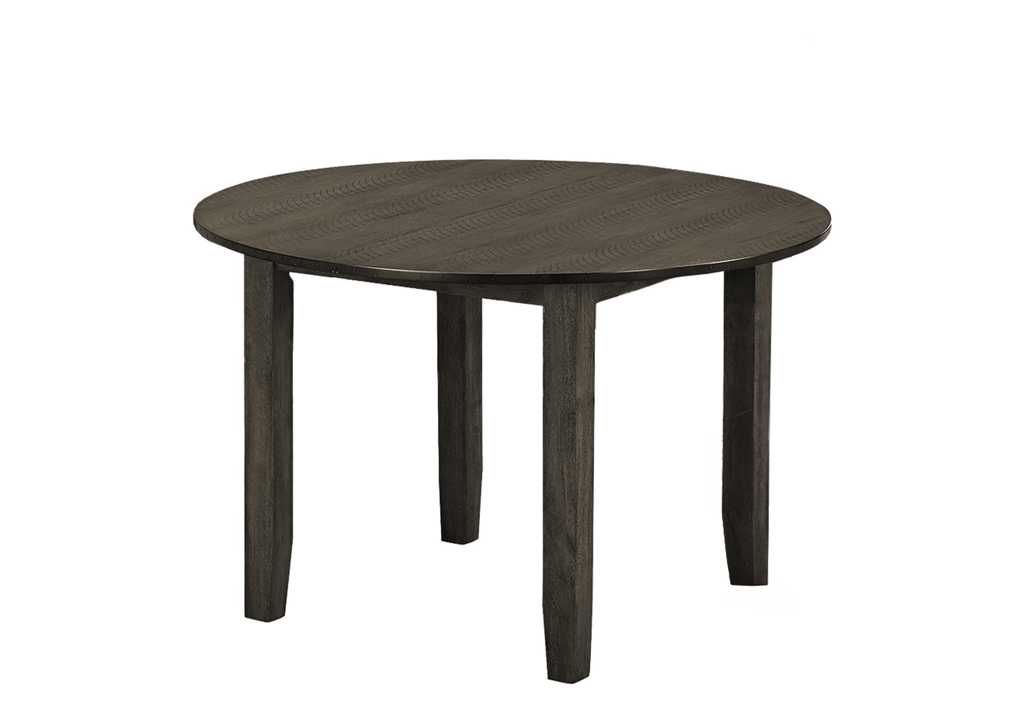 A fashionable style 48″ round dining table, perfect for small spaces, featuring a chic antique grey veneer top that effortlessly complements any transitional kitchen or dining room decor.