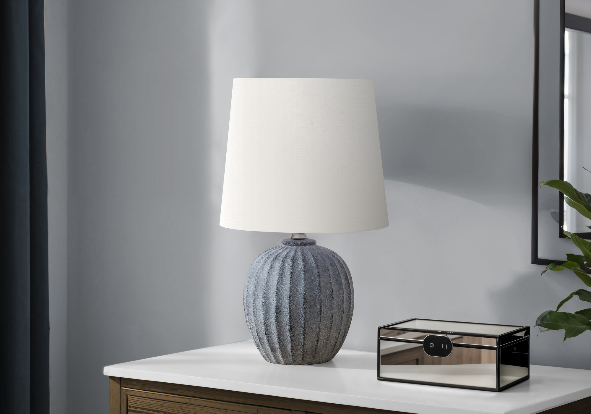 Switch up your living room, bedroom, or office into a chic haven of stylish decor with our 19″h table lamp. Created from high-quality grey resin, this lamp features a visually stunning, fluted, textured finish base in a concrete-look that adds a touch of elegance on any console, nightstand, end or side table. The soft ivory fabric shade casts a warm ambiance, perfect for creating a cozy atmosphere in a bedroom, living room, or office space. The convenient on/off turn knob switch that operates a 60W standard bulb (not included), allows for easy accessibility to illuminate a room, making this decorative lighting the ideal choice for any modern setting. Backed by a 2 year limited warranty against manufacturer defects, this accent lamp is a made with reliable materials making it a smart and stylish investment for your home decor.