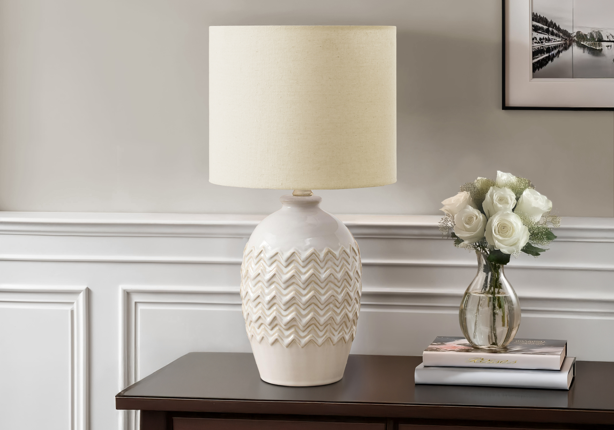 Enrich your home with this stylish and trendy 19″h table lamp, perfect for adding a touch of elegance to any room. Crafted from high quality ivory ceramic, this decorative lamp features a stunning textured finish base in a raised zig-zag relief pattern as a fashionable accent in your living room, bedroom, or home office space. The refined beige fabric shade casts a warm glow, creating an inviting ambiance that will instantly transform your side or end table, console, or nightstand into a cozy retreat. This chic, transitional style lamp is not just a pretty face but also functional with the convenient on/off turn knob switch that operates up to a 60W standard bulb (not included), making it easy to illuminate a space. Backed by a 2 year limited warranty against manufacturer defects, you can rest assured this lamp is a reliable and durable purchase. This table lamp is the perfect choice for anyone looking to elevate their home lighting experience from casual to something more upscale.