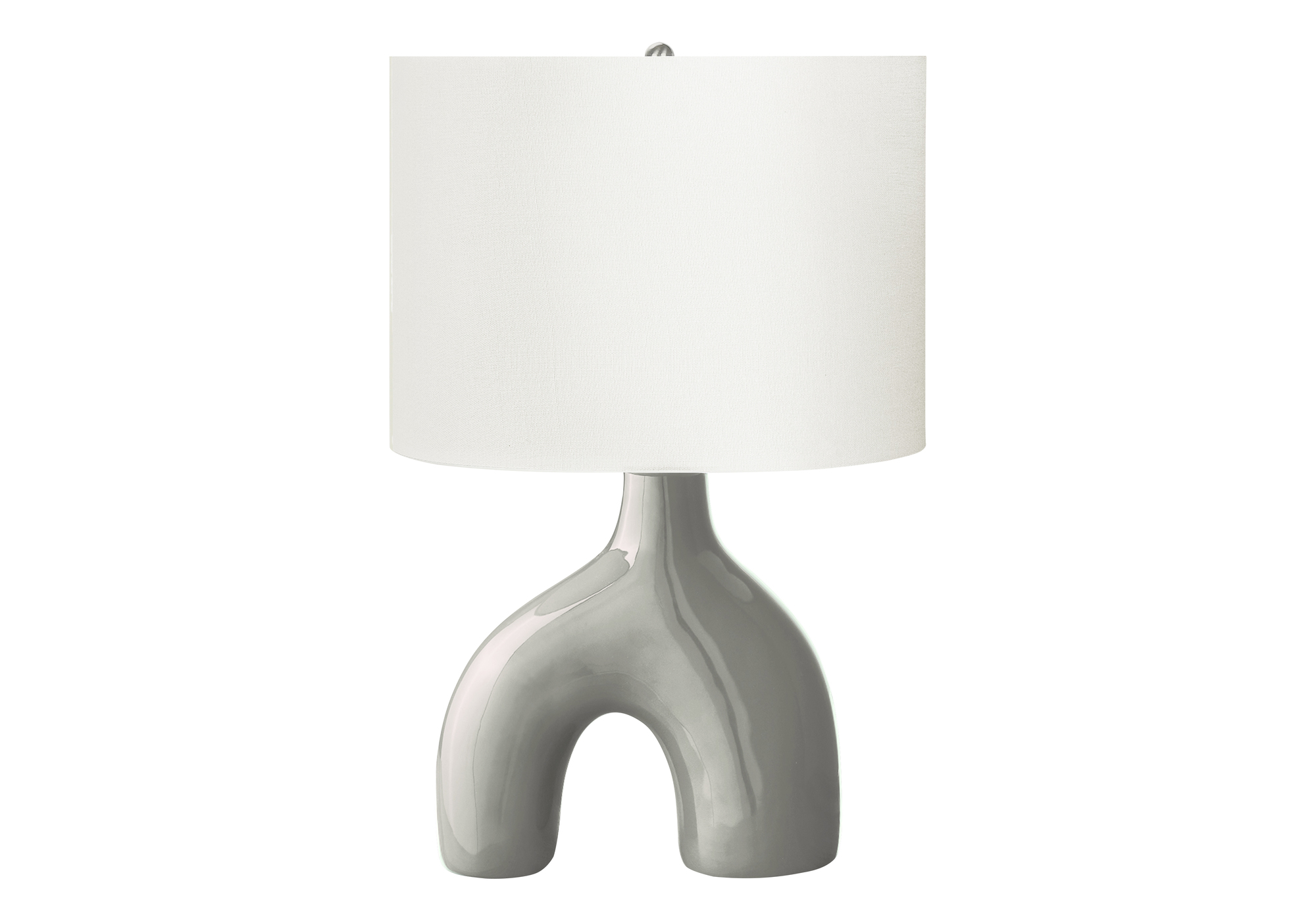 Add a fun and decorative element to your home with this stylish, mid-century inspired 25″h table lamp in light grey ceramic with an elegant linen ivory shade. This decorative table lamp will brighten up any room with its contemporary and whimsical two-leg shape ceramic base and linen-blend fabric shade. A perfect size to place on an end or side table in your living room or office, or as a bedside lamp on your nightstand in your bedroom, this lamp will illuminate any space with a soft and inviting ambiance. Easy to use with an on/off rotary switch that houses a 100W light bulb (not included), this lighting fixture will be a standout in your space. Only minimal assembly is needed and backed with a 2 year limited warranty against manufacturer defects, you can trust in the quality and durability of this unique accent piece.
