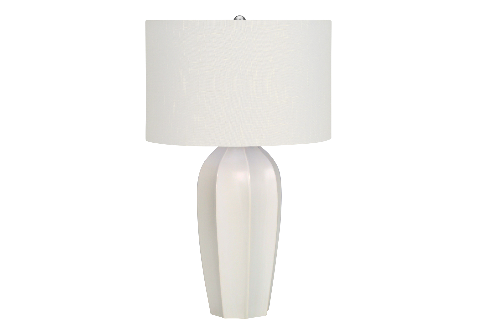 Bring some contemporary sophistication to any room with this stylish 27″h table lamp. A beautiful blend of art-deco with a modern edge, the smooth cream ceramic base in a tapered vase shape, is complimented with an elegant ivory linen drum shade, and finished with a silver metal finial on top. With a 3-way switch that houses a single bulb (not included) for a maximum output of 100W/120V, this lamp offers three levels of illuminating light for creating the ambiance you desire. Attached with a 5ft transparent cord, this is the perfect functional accent to place on an end or side table in a livingroom or home office, or bring it into your bedroom to set on a nightstand or bedside table. Made with high quality materials, this lamp includes a 2 year limited warranty against any manufacturer’s defects for a worry-free purchase.