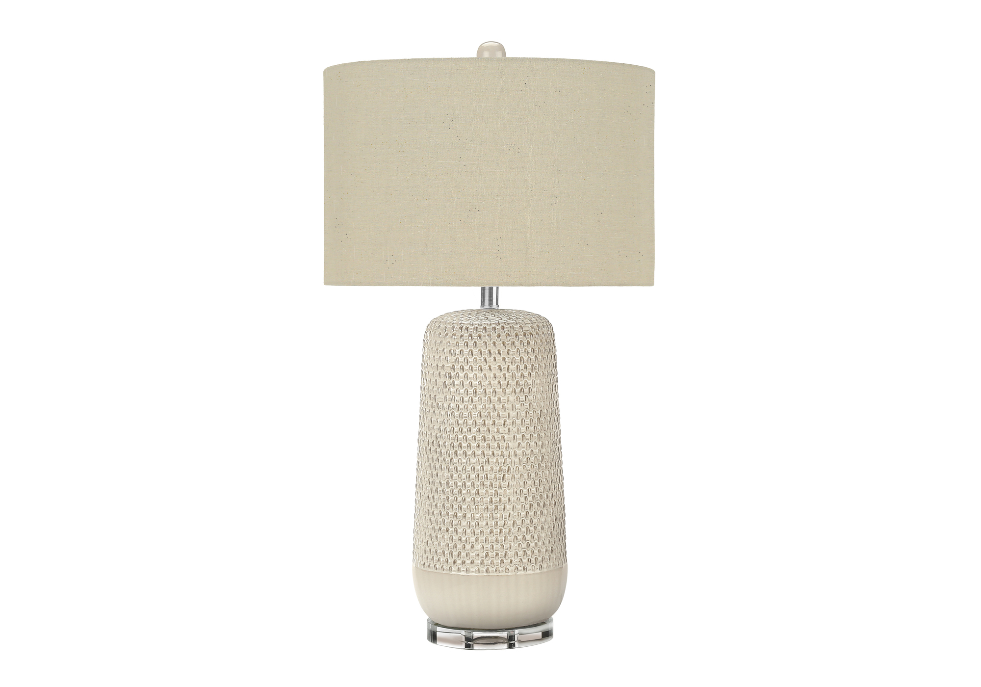 Add some contemporary boho flair in a room with this 31″h table lamp in an attractive cream ceramic textured body with a raised pattern atop a clear acrylic base, topped with a simple beige fabric drum shade and finished with a round ceramic finial.