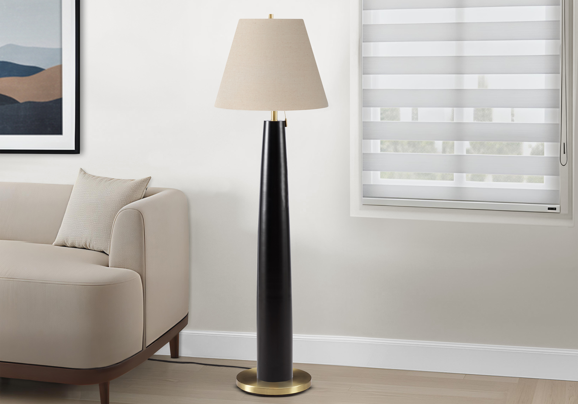 Add a refined finishing touch to your home with this 62″h floor lamp, thoughtfully designed to accent and illuminate modern living spaces. With its tall, sculptural profile and clean lines, this lamp brings subtle sophistication to living rooms, bedrooms, or home offices. A sleek black metal body rises from a warm brass-finish base and is topped with a soft beige fabric shade, creating a balanced mix of contrast and warmth that works effortlessly with a variety of decor styles. More than just a decorative lighting solution and designed for everyday convenience, the lamp features an easy-to-use pull-chain switch for straightforward on/off control. A bulb is not included, allowing you to choose a compatible bulb up to 100W to suit your lighting needs. Backed by a 2-year limited warranty, this floor lamp offers dependable quality and timeless appeal, an ideal blend of style, function, and lasting value.
