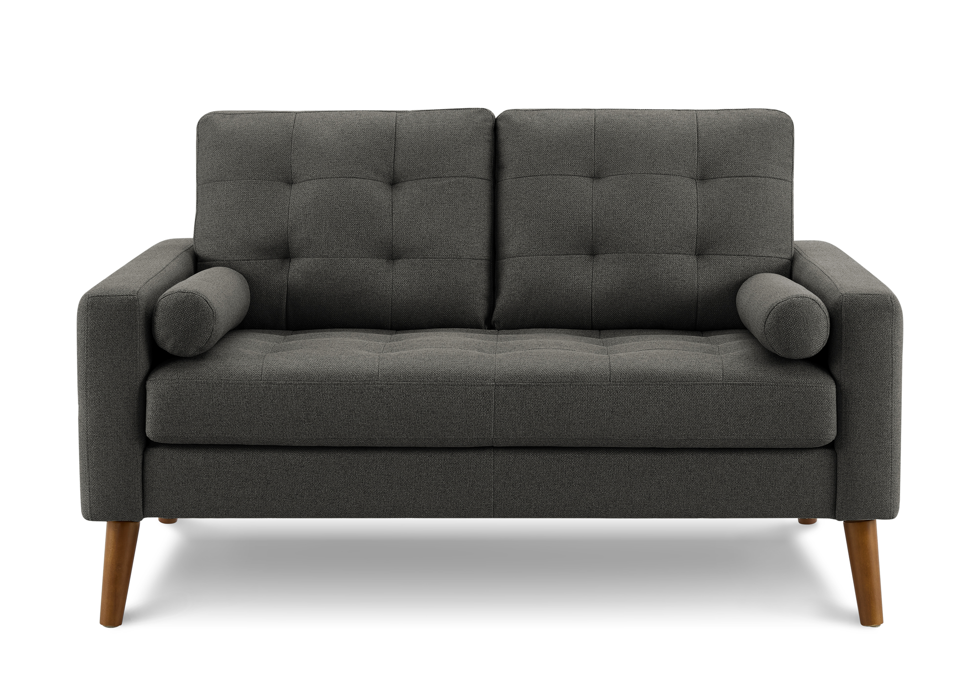 This 58″ long love seat combines modern elegance with timeless mid century appeal, showcasing dark grey fabric upholstered seating, a tufted seat and back for added texture, clean square arms, and warm walnut wood legs.