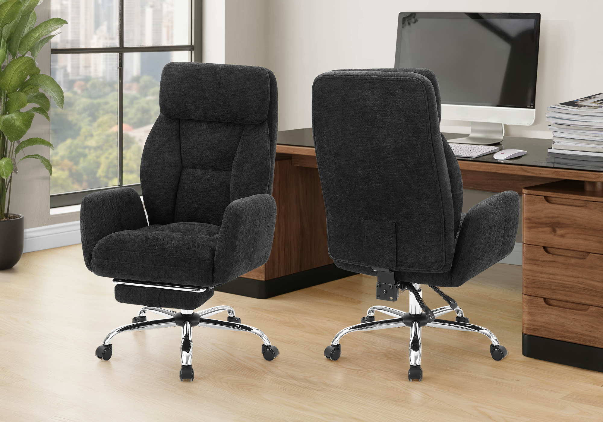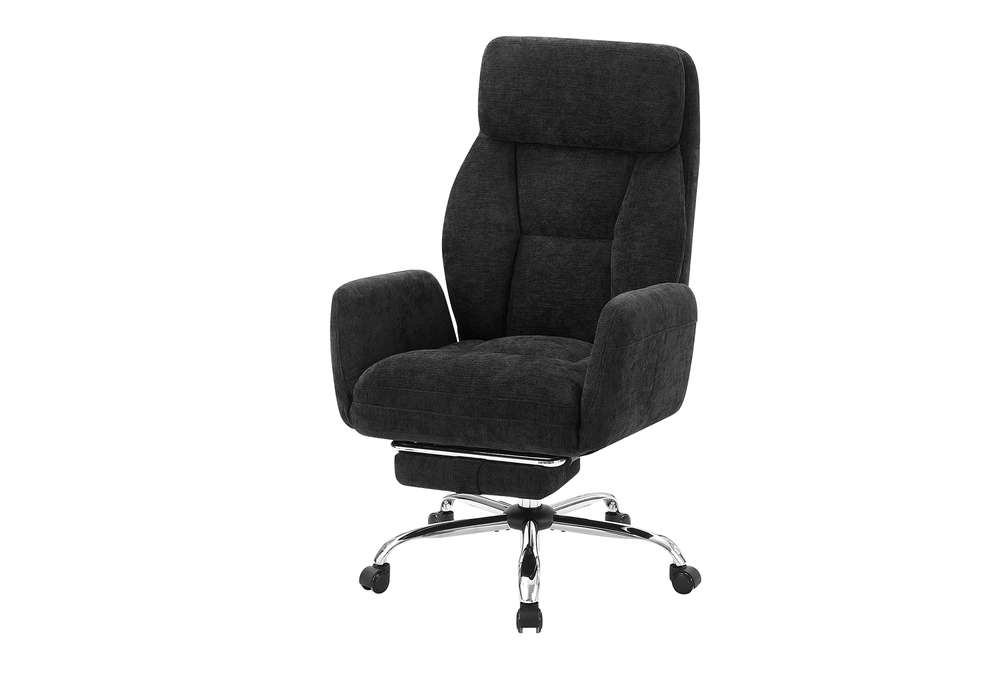 Designed for productivity and everyday comfort, this modern office chair is an ideal compliment to any computer desk. Upholstered in sleek black fabric and accented with refined chrome metal details, it delivers a robust, fashionable style that suits both professional offices and contemporary home office setups. The ergonomic high-back design, combined with plush foam cushioning, ensures exceptional comfort during extended work sessions. For moments of relaxation, simply flip open the footrest, unlock the tilt-back mechanism to fully recline and enjoy a little break from your daily tasks. The adjustable head rest, seat height settings, supportive armrests, and a smooth swivel base with casters allow for effortless movement and personalized positioning throughout the day. Durably designed and upholstered with quality materials, this high back office chair is easy to assemble with all parts and illustrated instructions included, and built for lasting performance. Backed by a 5-year limited warranty, it offers long-term confidence while combining functionality, comfort, and modern appeal in one versatile seating solution.