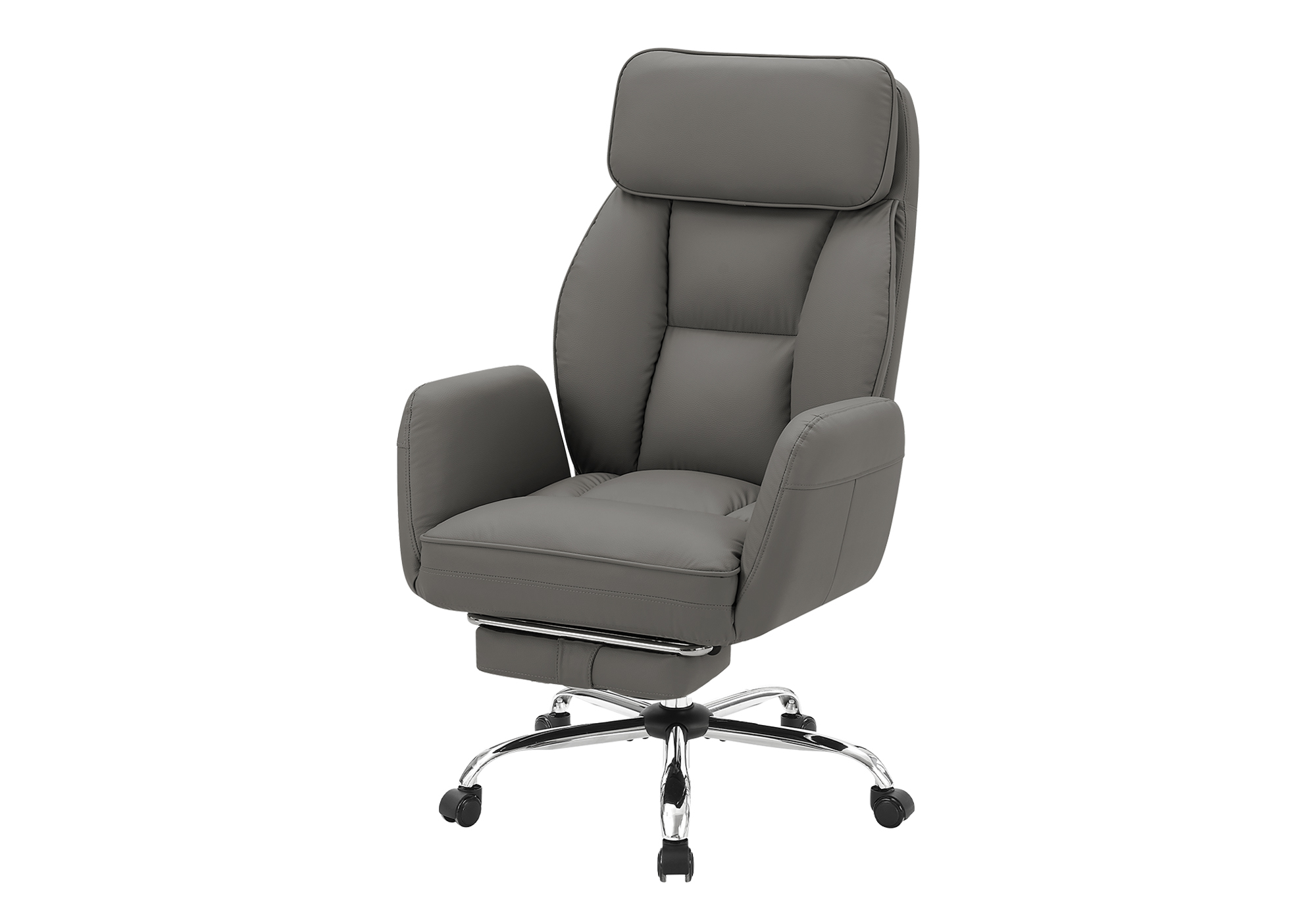 Designed for productivity and everyday comfort, this modern office chair is an ideal compliment to any computer desk. Upholstered in a sleek dark grey leather-look fabric and accented with refined chrome metal details, it delivers a robust, fashionable style that suits both professional offices and contemporary home office setups. The ergonomic high-back design, combined with plush foam cushioning, ensures exceptional comfort during extended work sessions. For moments of relaxation, simply flip open the footrest, unlock the tilt-back mechanism to fully recline and enjoy a little break from your daily tasks. The adjustable head rest, seat height settings, supportive armrests, and a smooth swivel base with casters allow for effortless movement and personalized positioning throughout the day. Durably designed and upholstered with quality materials, this high back office chair is easy to assemble with all parts and illustrated instructions included, and built for lasting performance. Backed by a 5-year limited warranty, it offers long-term confidence while combining functionality, comfort, and modern appeal in one versatile seating solution.