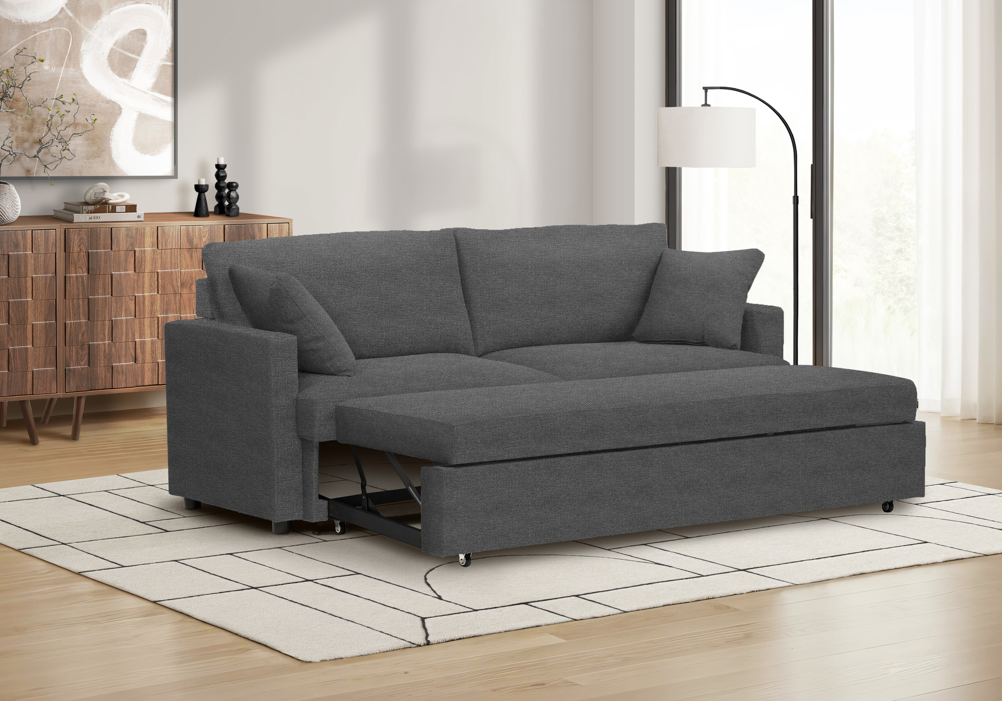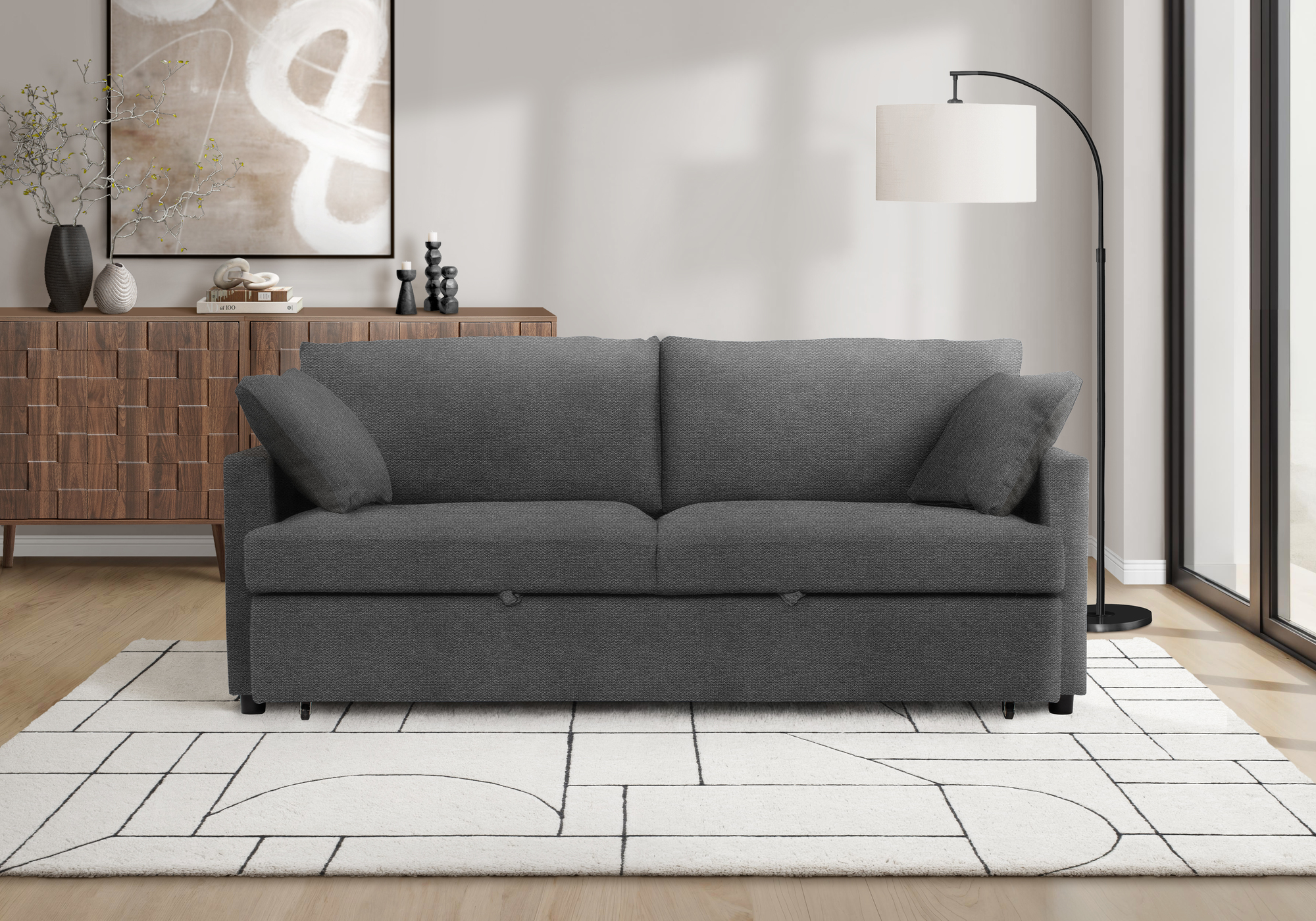 If you are craving a combination of comfort and simple contemporary style, then this stylish and functional sleeper sofa will instantly elevate your space! Upholstered in a sophisticated dark grey fabric with two matching throw pillows, this durable sleeper sofa embodies modern elegance while ensuring durability that stands the test of time. With a generous 78″ length, this sofa seamlessly transforms from a chic seating arrangement into a cozy convertible sofa bed, making it perfect for both lounging and accommodating overnight guests. You will appreciate the smooth pull-out mechanism on casters, allowing for effortless transitions from sofa to bed in seconds. The back and wide seat cushions have a pocket spring system topped with high density foam wrapped in Dacron, making it a supremely comfortable seating and sleeping option whether you place it in your living room, family room or office space. Enjoy peace of mind with our 1 year limited warranty, a testament to our commitment to quality and customer satisfaction.