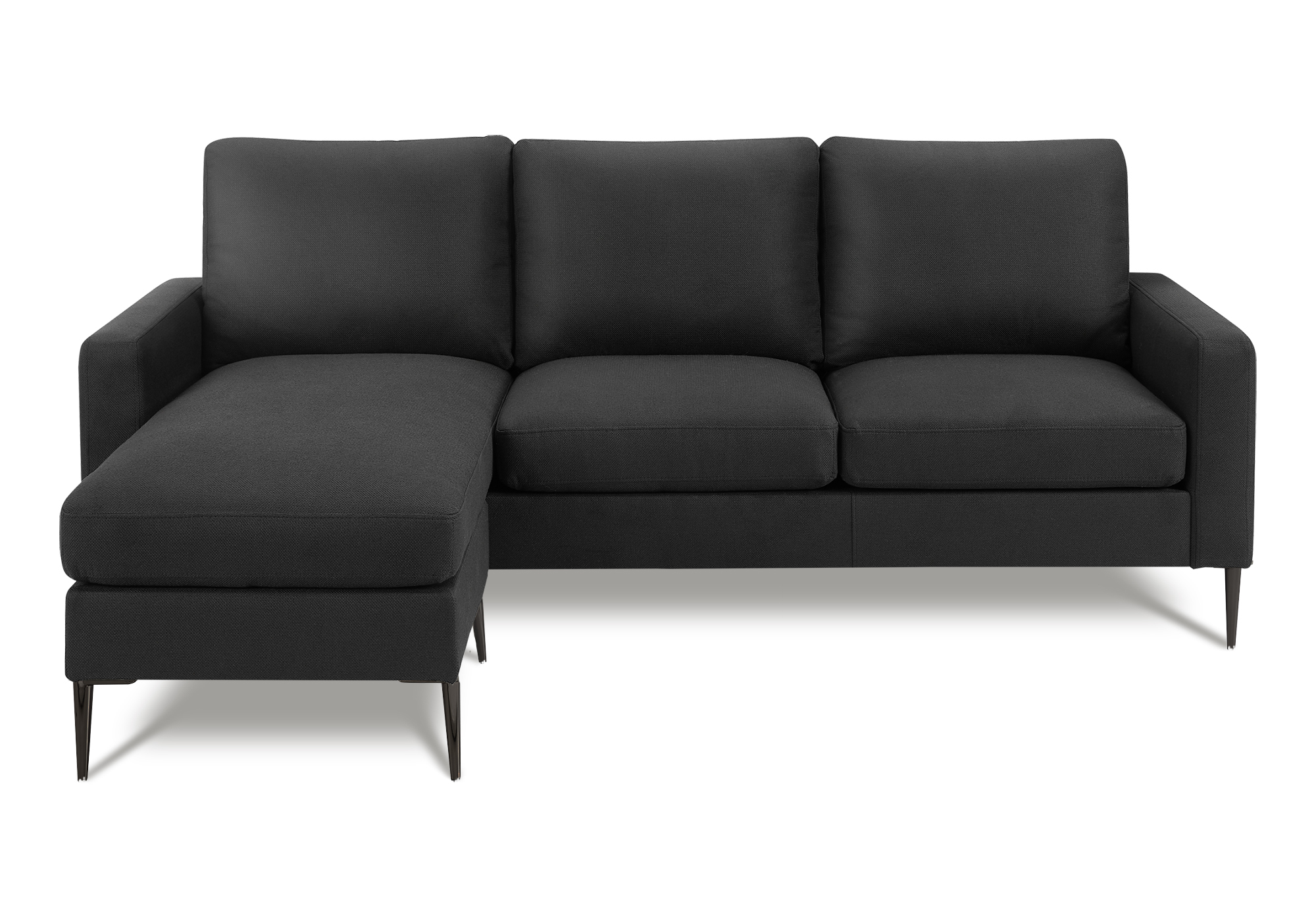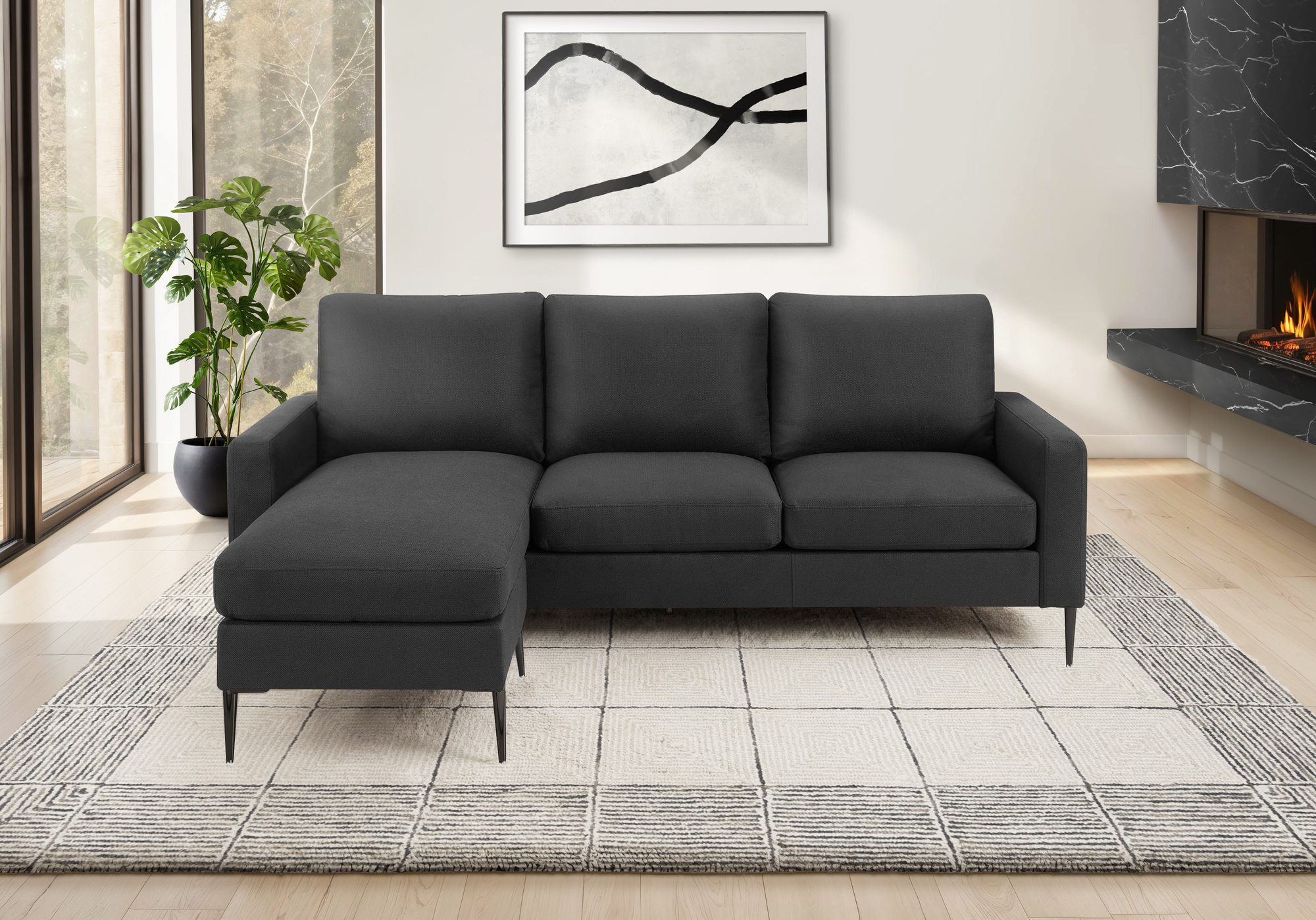 Crafted with modern sophistication in mind, the sofa lounger is a refined expression of style and everyday comfort. Measuring an impressive 85″ wide, this L-shaped seating solution offers a left or right setup for the chaise lounge, allowing it to adapt seamlessly to a variety of room layouts. Upholstered in a chic black fabric, the sofa lounger delivers a sleek, contemporary appearance while remaining durable for daily use. Padded cushions with supportive pocket coil seating provides a comfortable, well-balanced lounging experience ideal for extended relaxation. Clean square arms enhance the modern silhouette, while black metal legs add a subtle industrial edge and reliable stability. Thoughtfully designed padded surfaces create an inviting space for unwinding or entertaining guests. Easy assembly ensures quick setup, and a 1-year limited warranty offers added peace of mind. Whether hosting friends or enjoying a quiet night in, the sofa lounger offers a seamless blend of style, function, and modern appeal.
